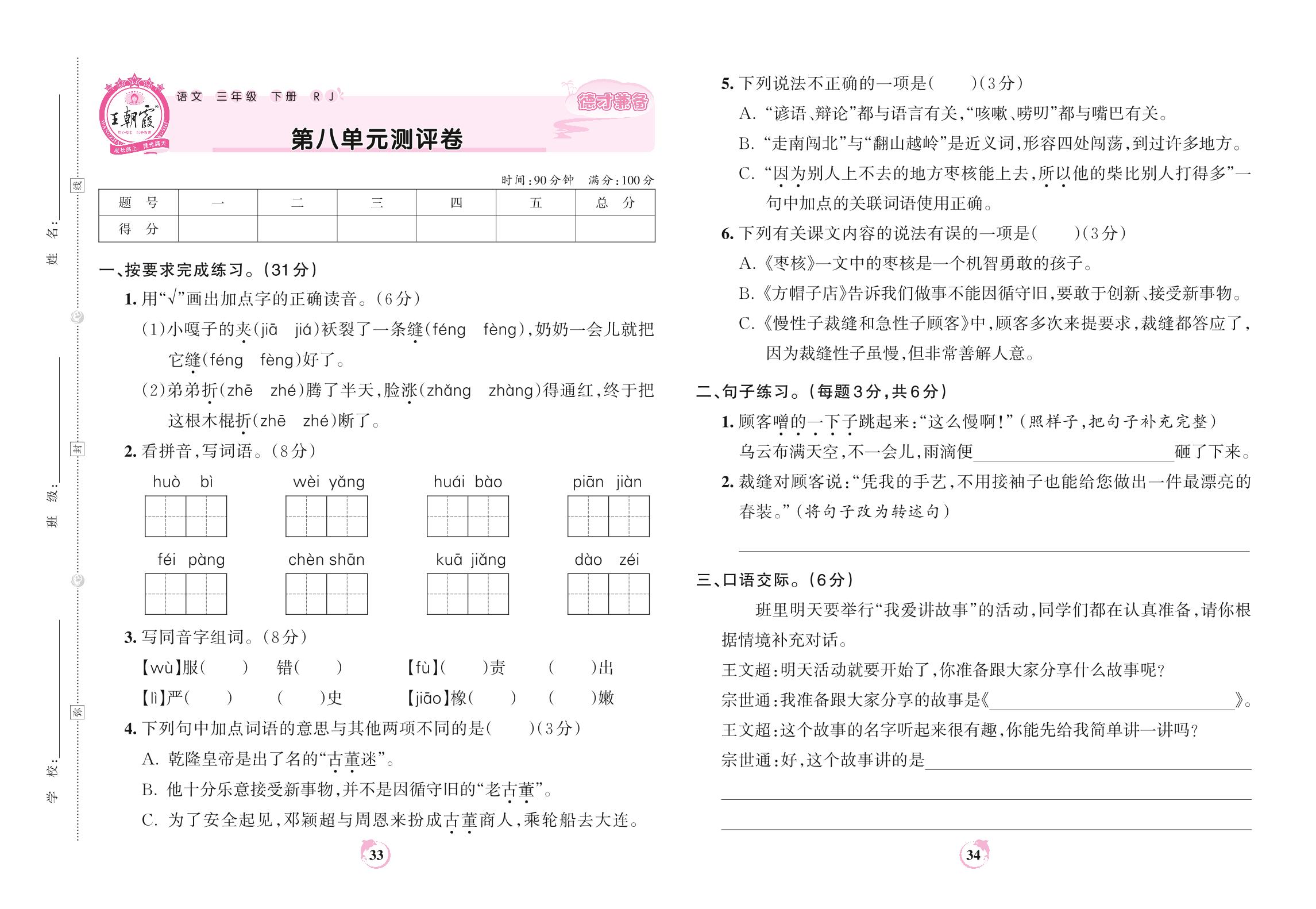 三年级语文人教版下册单元卷
