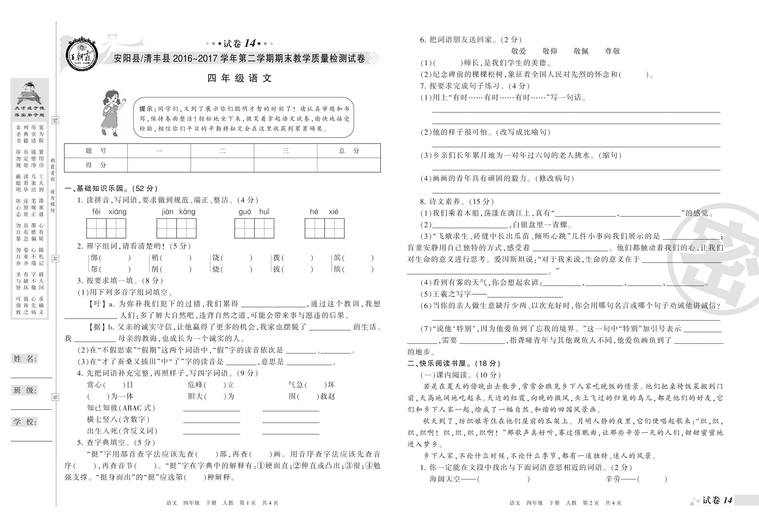 2016-2017学年第二学期安阳市安阳县清丰县四年级语文试卷(人教版)【14】