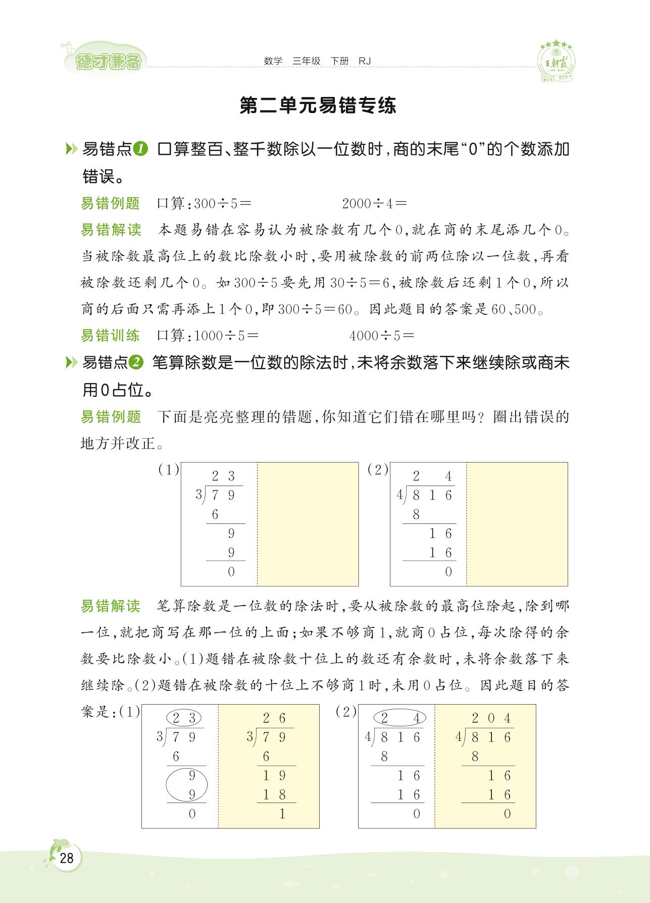 2022下册三年级数学人教版 第二单元 除数是一位数的除法——第二单元易错专练