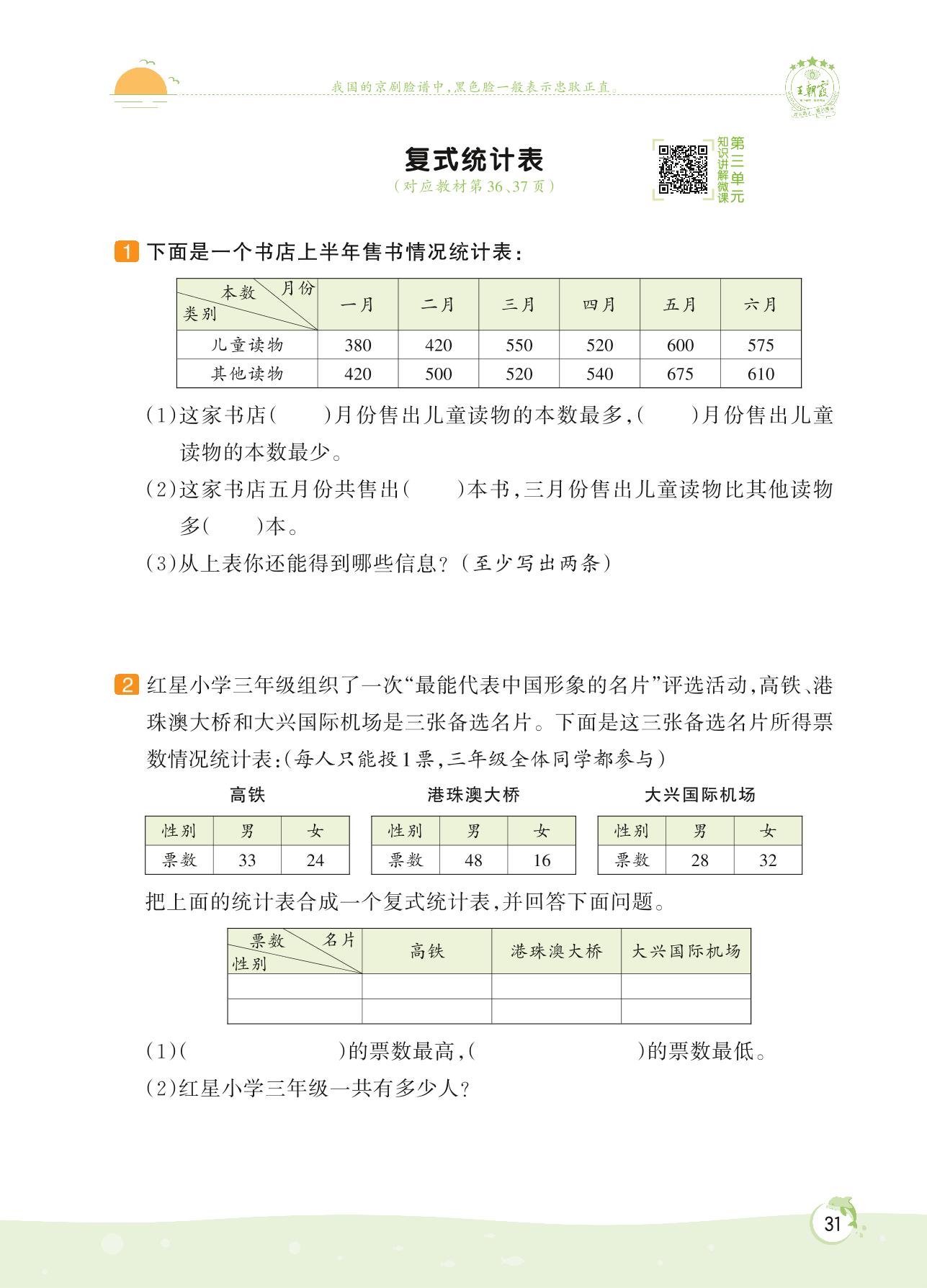 2022下册三年级数学人教版 第三单元 复式统计表——复式统计表