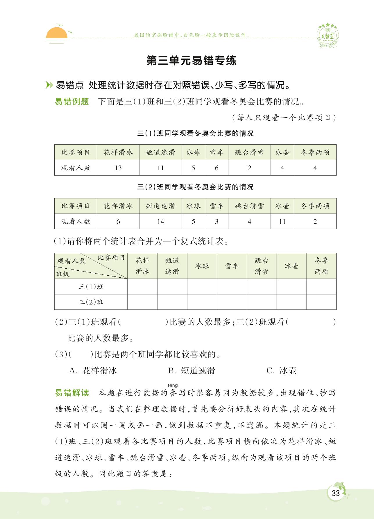2022下册三年级数学人教版 第三单元 复式统计表——第三单元易错专练