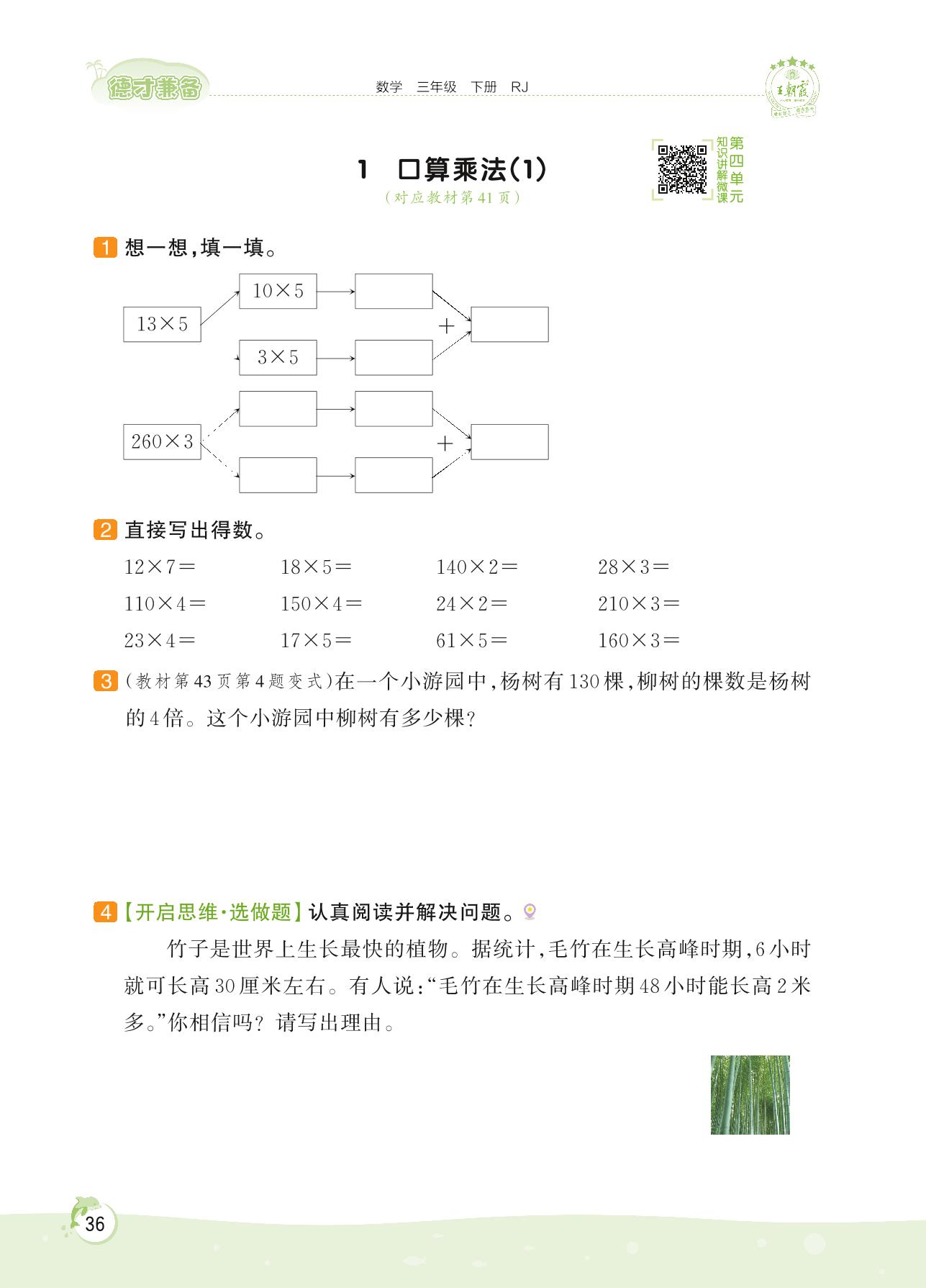 2022下册三年级数学人教版 第四单元 两位数乘两位数——1 口算乘法(1)