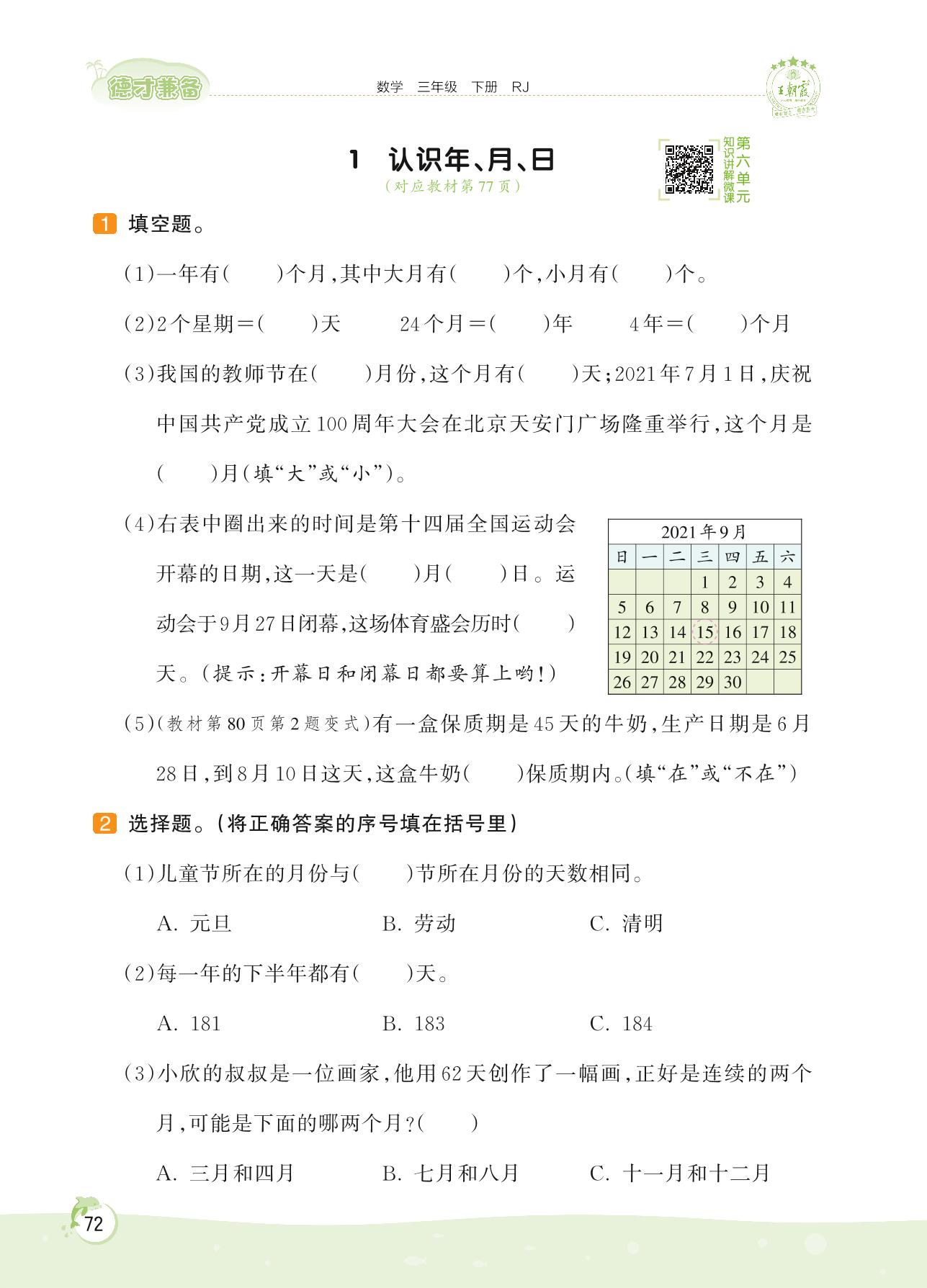 2022下册三年级数学人教版 第六单元 年、月、日——1 认识年、月、日