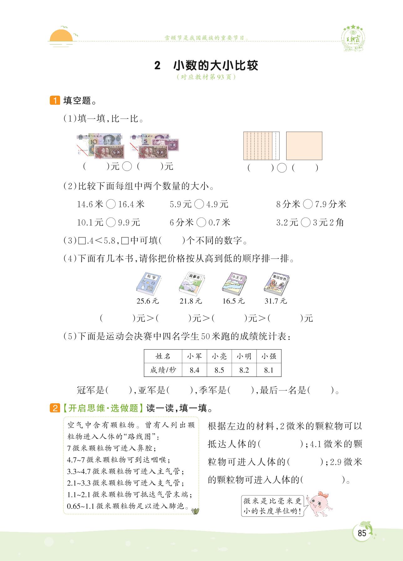 2022下册三年级数学人教版 第七单元 小数的初步认识——2 小数的大小比较