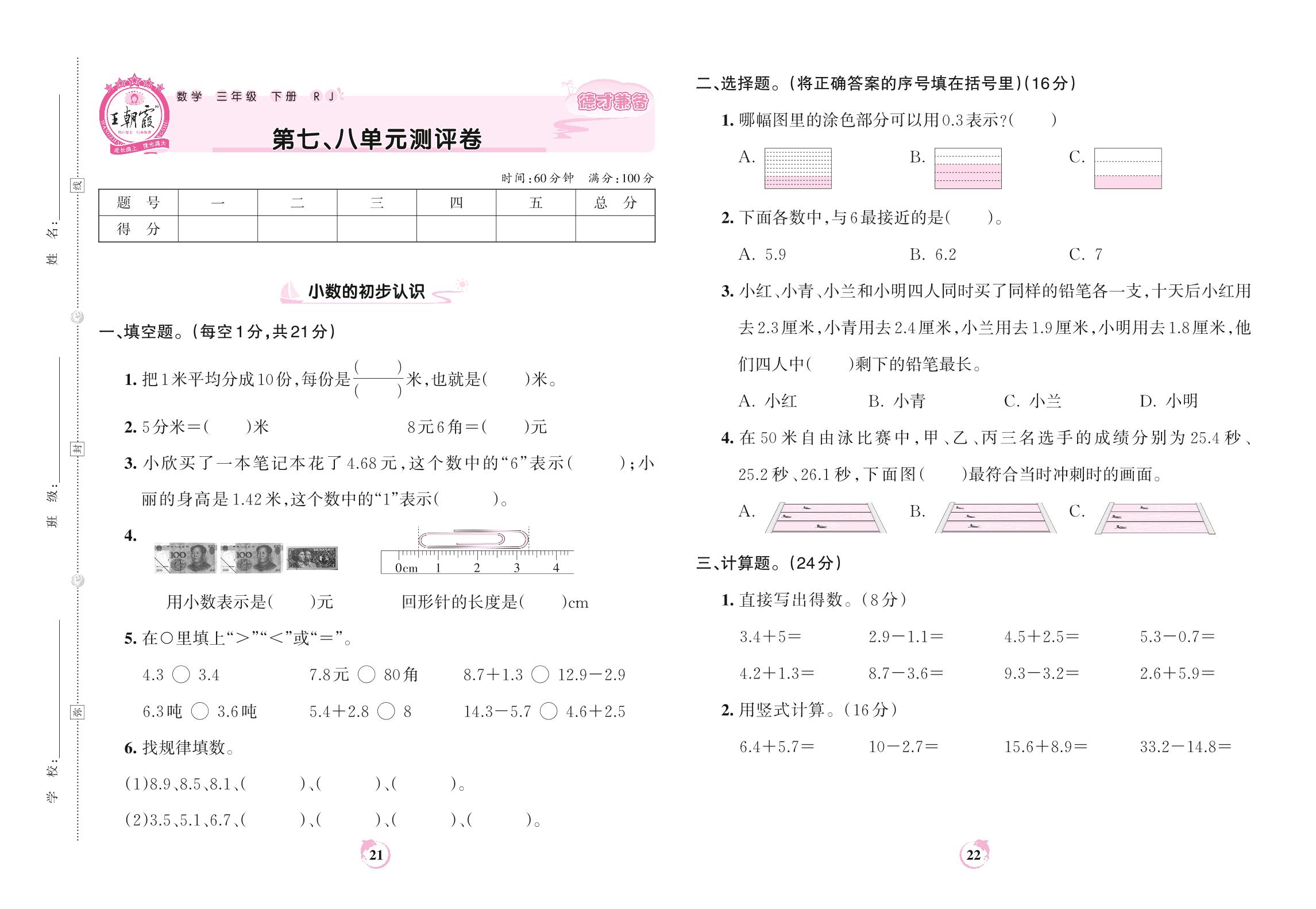 2022下册三年级数学人教版 第七、八单元测评卷