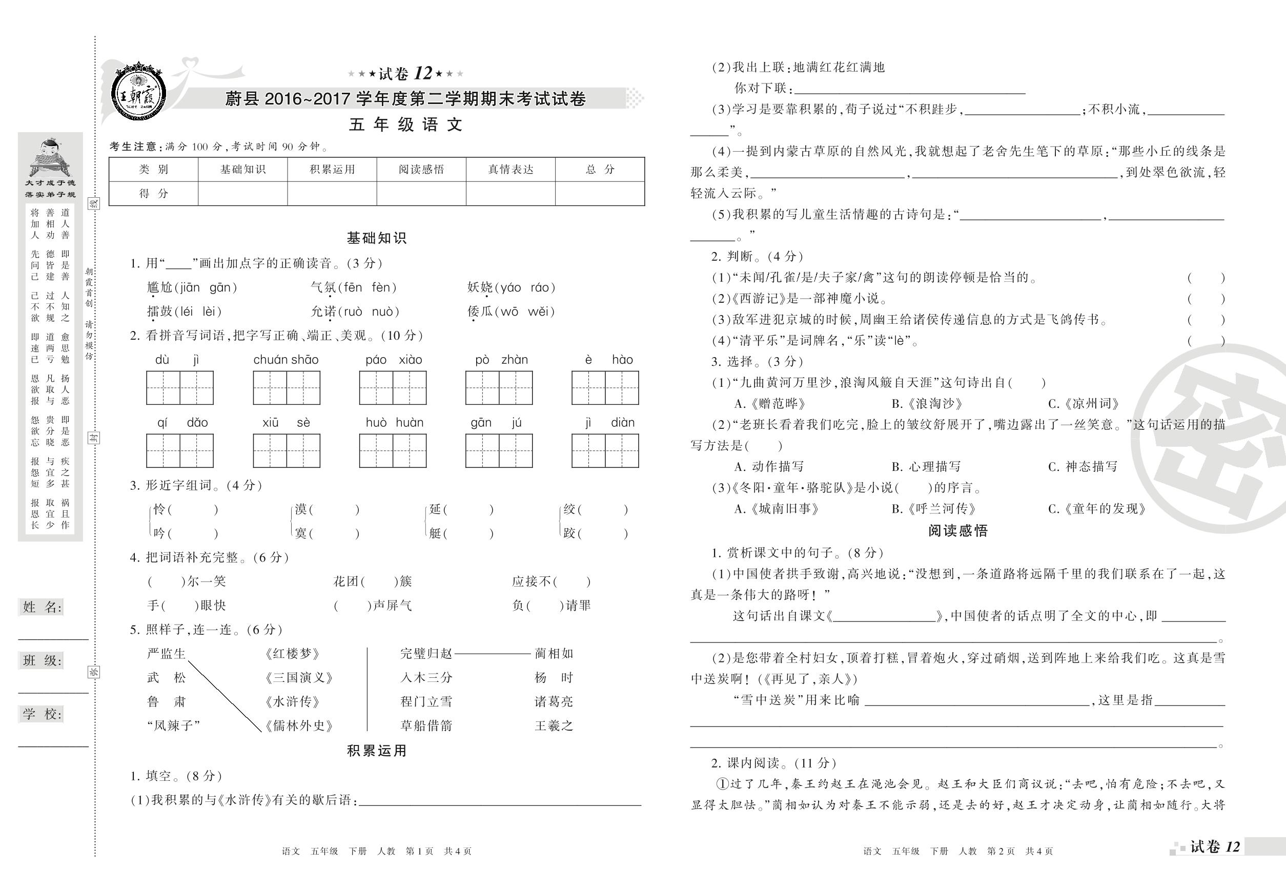 2016-2017学年第二学期张家口市蔚县五年级语文试卷(人教版)【12】
