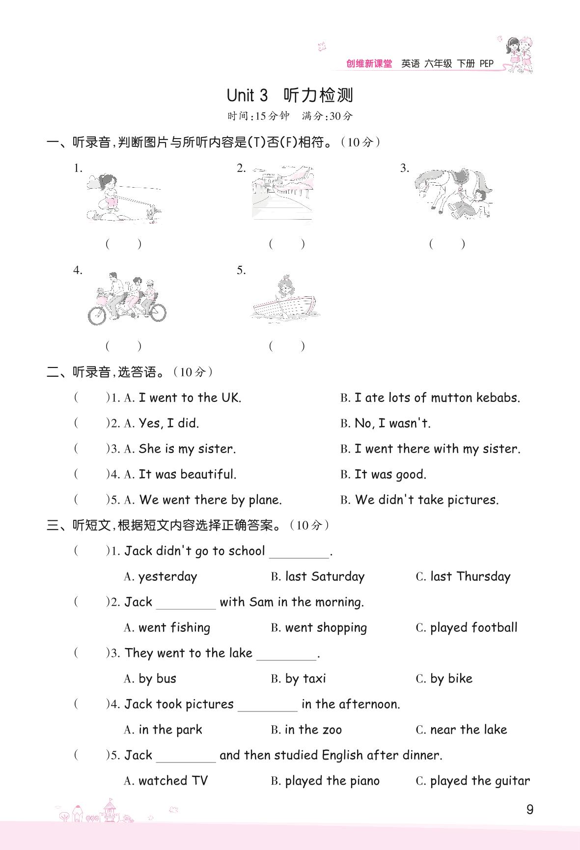 2022下册六年级英语人教PEP版 Unit 3 Where did you go?—听力检测
