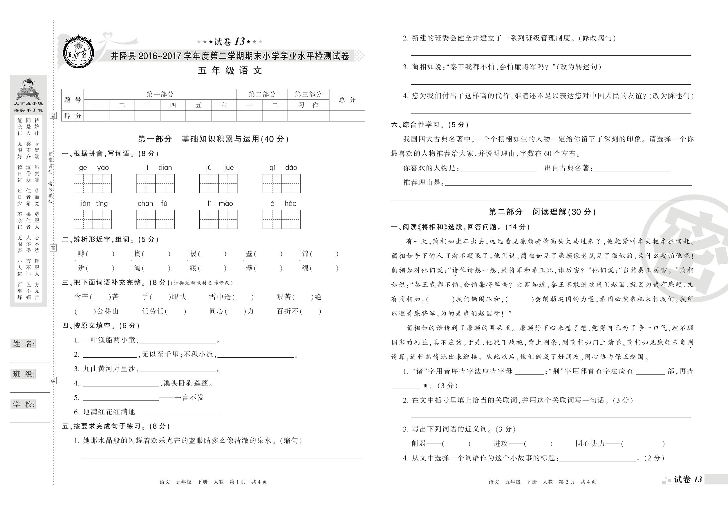 2016-2017学年第二学期石家庄市井陉县五年级语文试卷(人教版)【13】