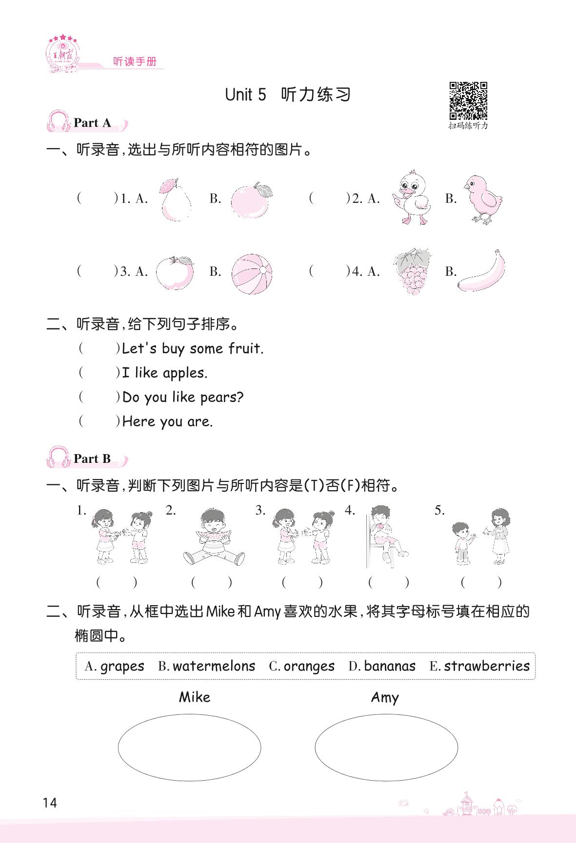 2022下册三年级英语人教PEP版 Unit 5 Do you like pears?—Part A、Part B 听力练习
