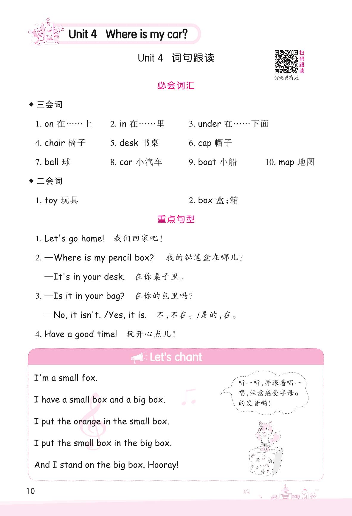 2022下册三年级英语人教PEP版 Unit 4 Where is my car?—词句跟读