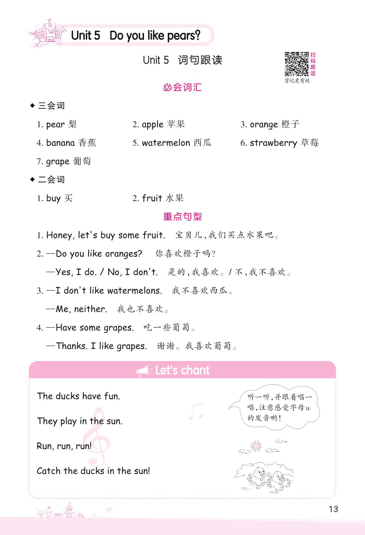 2022下册三年级英语人教PEP版 Unit 5 Do you like pears?—词句跟读