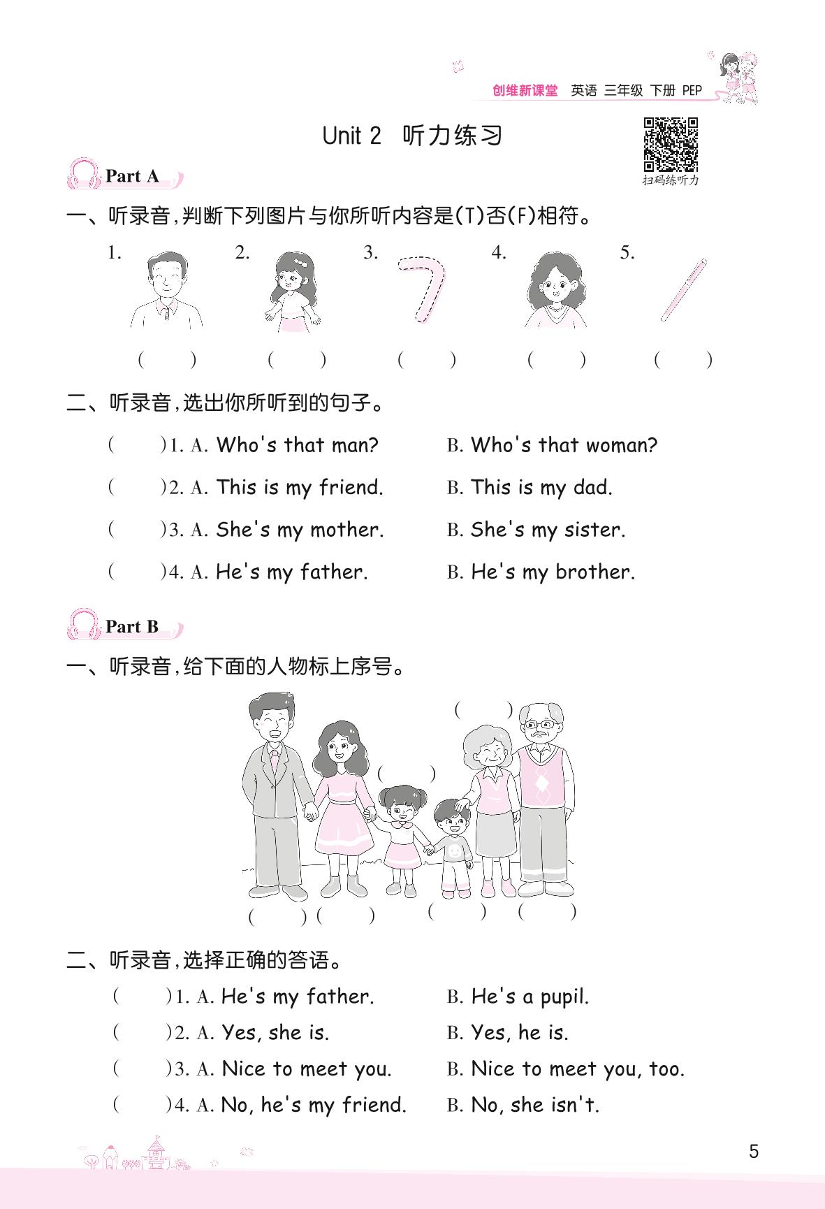 2022下册三年级英语人教PEP版 Unit 2 My family—Part A、Part B 听力练习