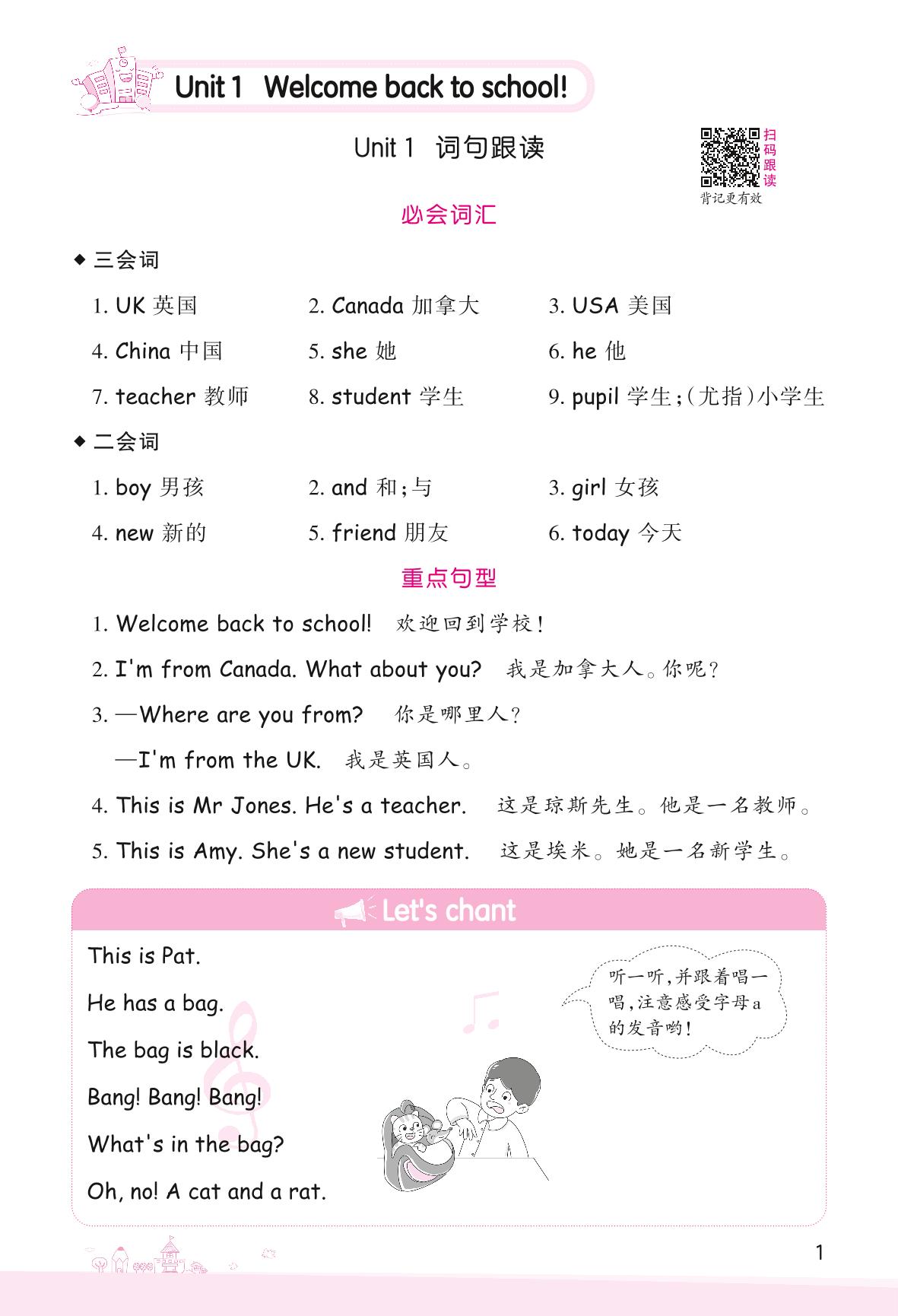 2022下册三年级英语人教PEP版 Unit 1 Welcome back to school!—词句跟读