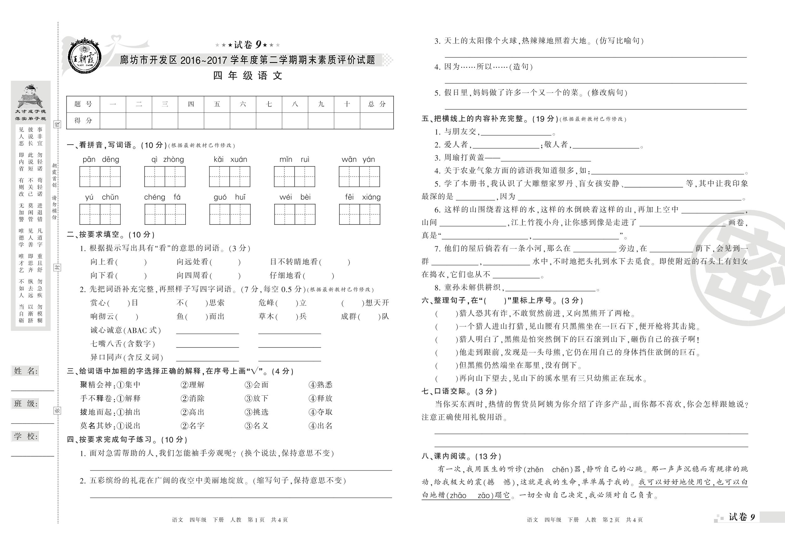 2016-2017学年第二学期廊坊市开发区四年级语文试卷(人教版)【9】