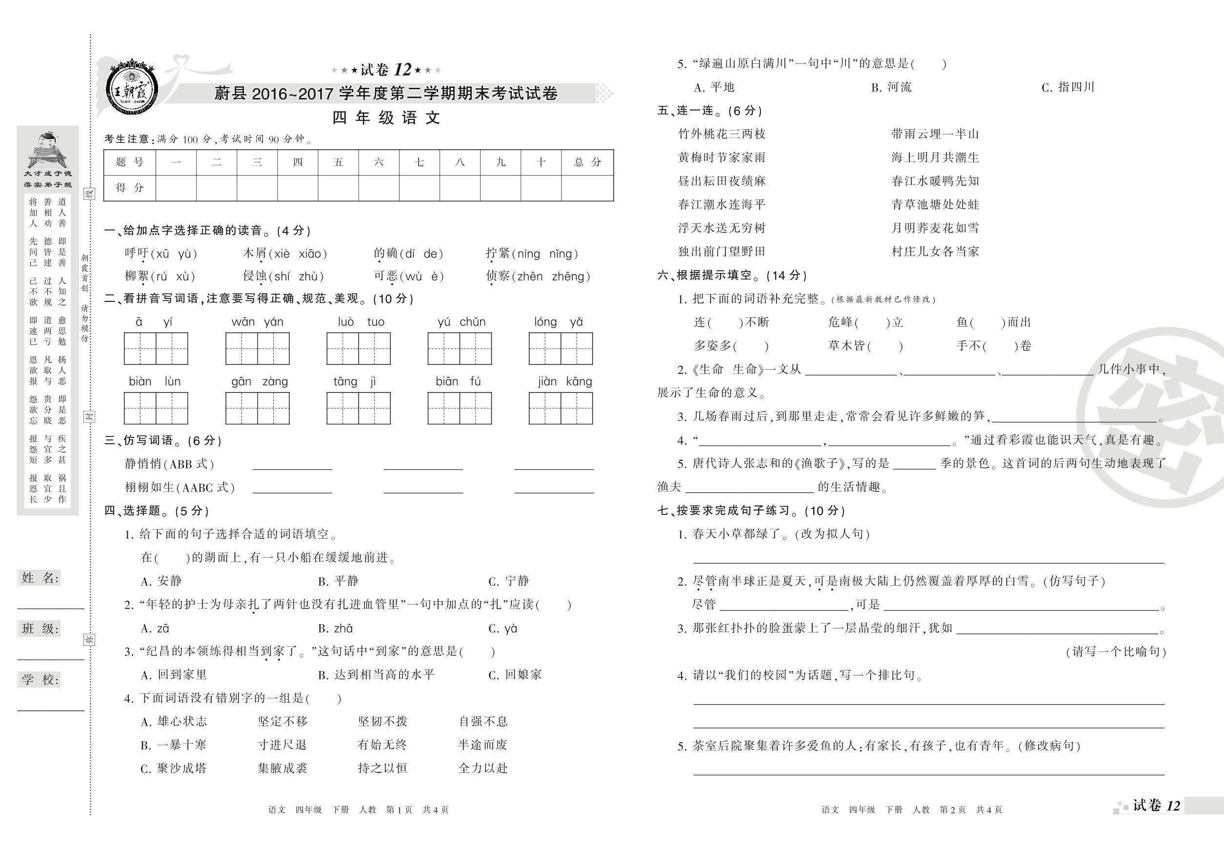 2016-2017学年第二学期张家口市蔚县四年级语文试卷(人教版)【12】