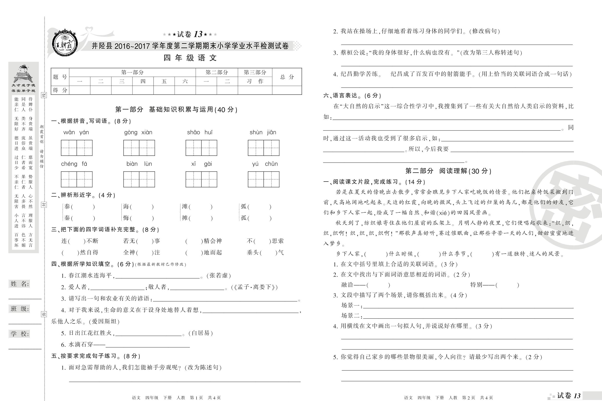 2016-2017学年第二学期石家庄市井陉县四年级语文试卷(人教版)【13】