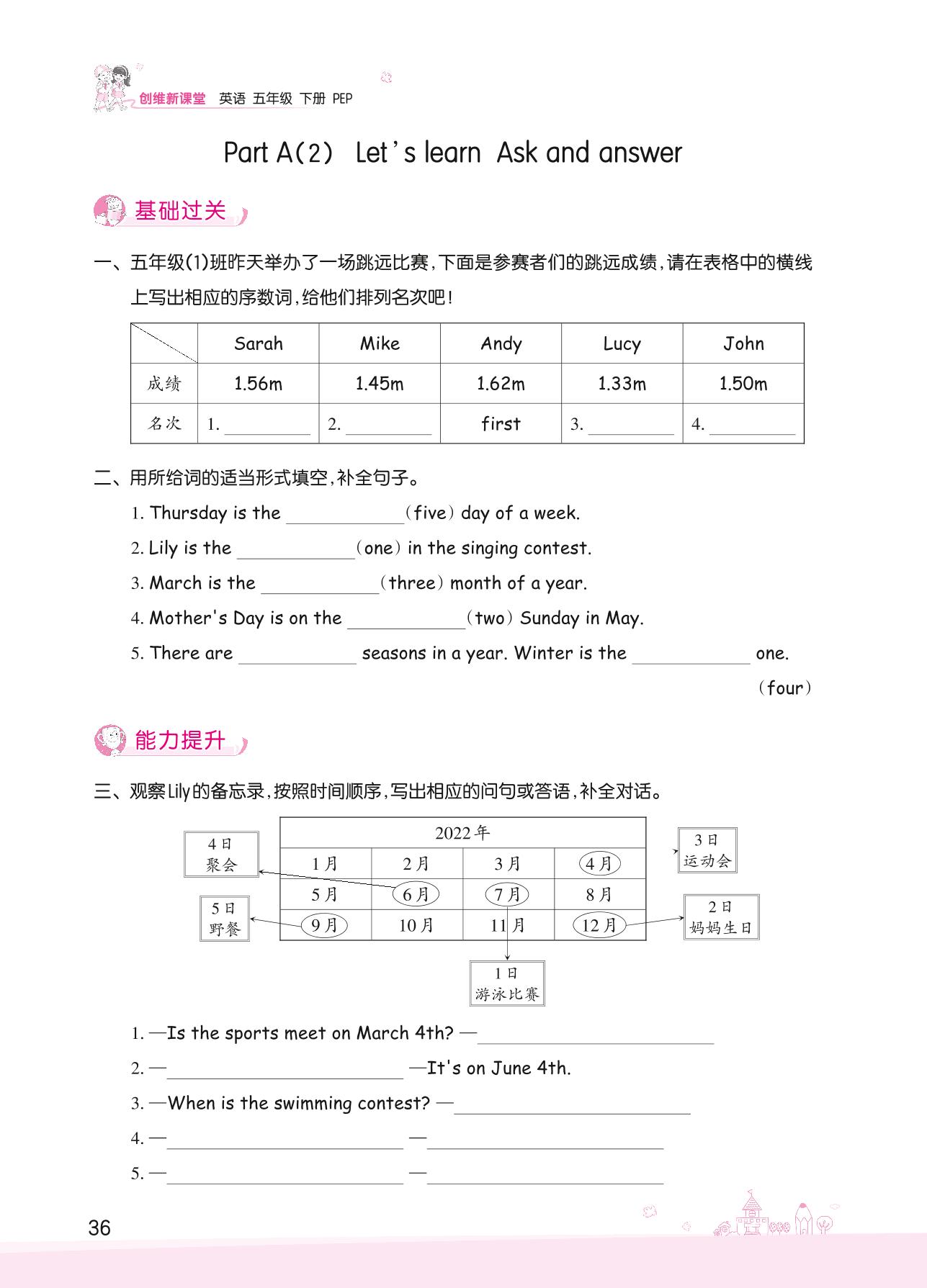 2022下册五年级英语人教PEP版 Unit 4—Part A(2) Let’s learn Ask and answer