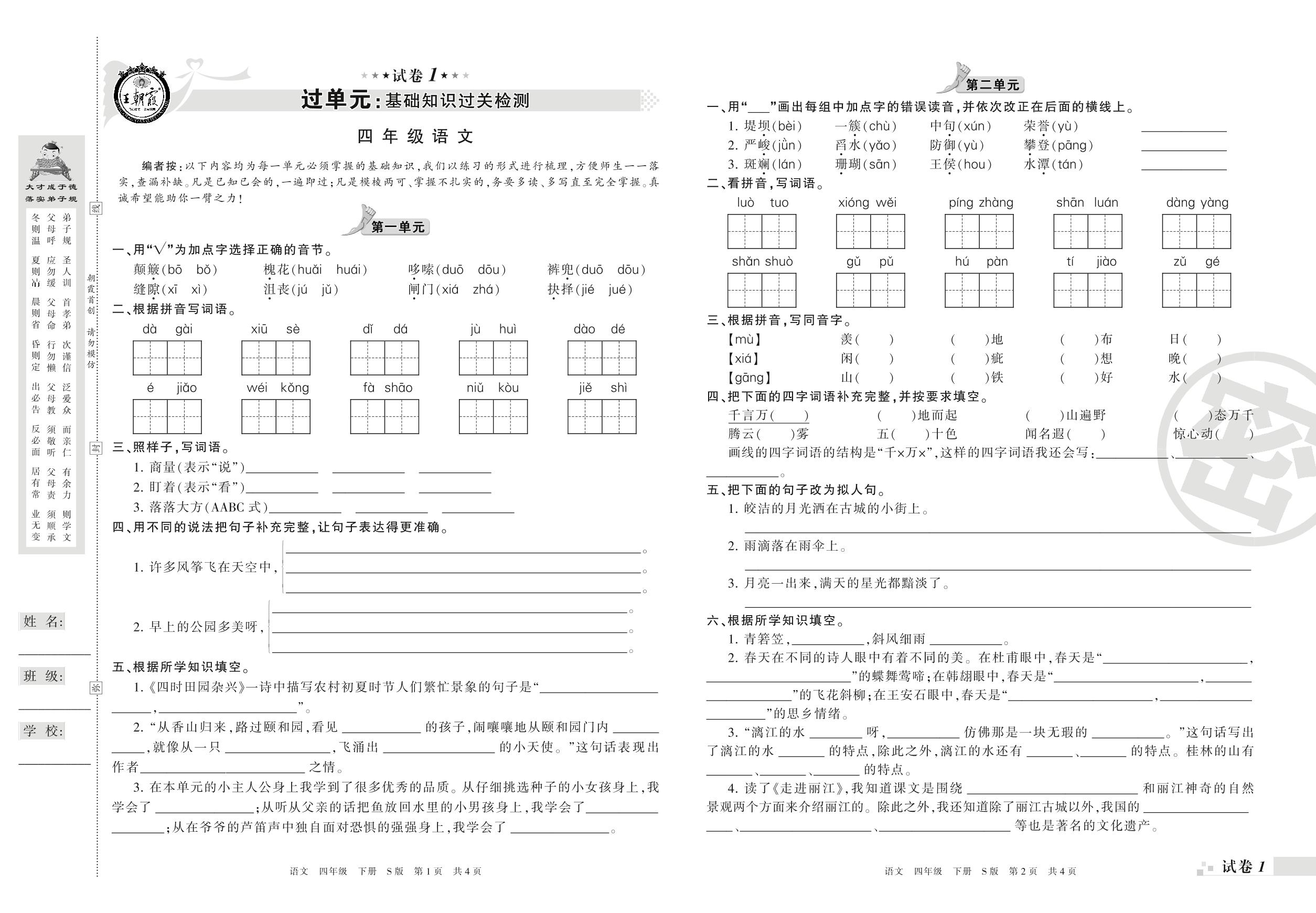 王朝霞期末过单元——基础知识过关检测四年级下册语文(S版)【1】