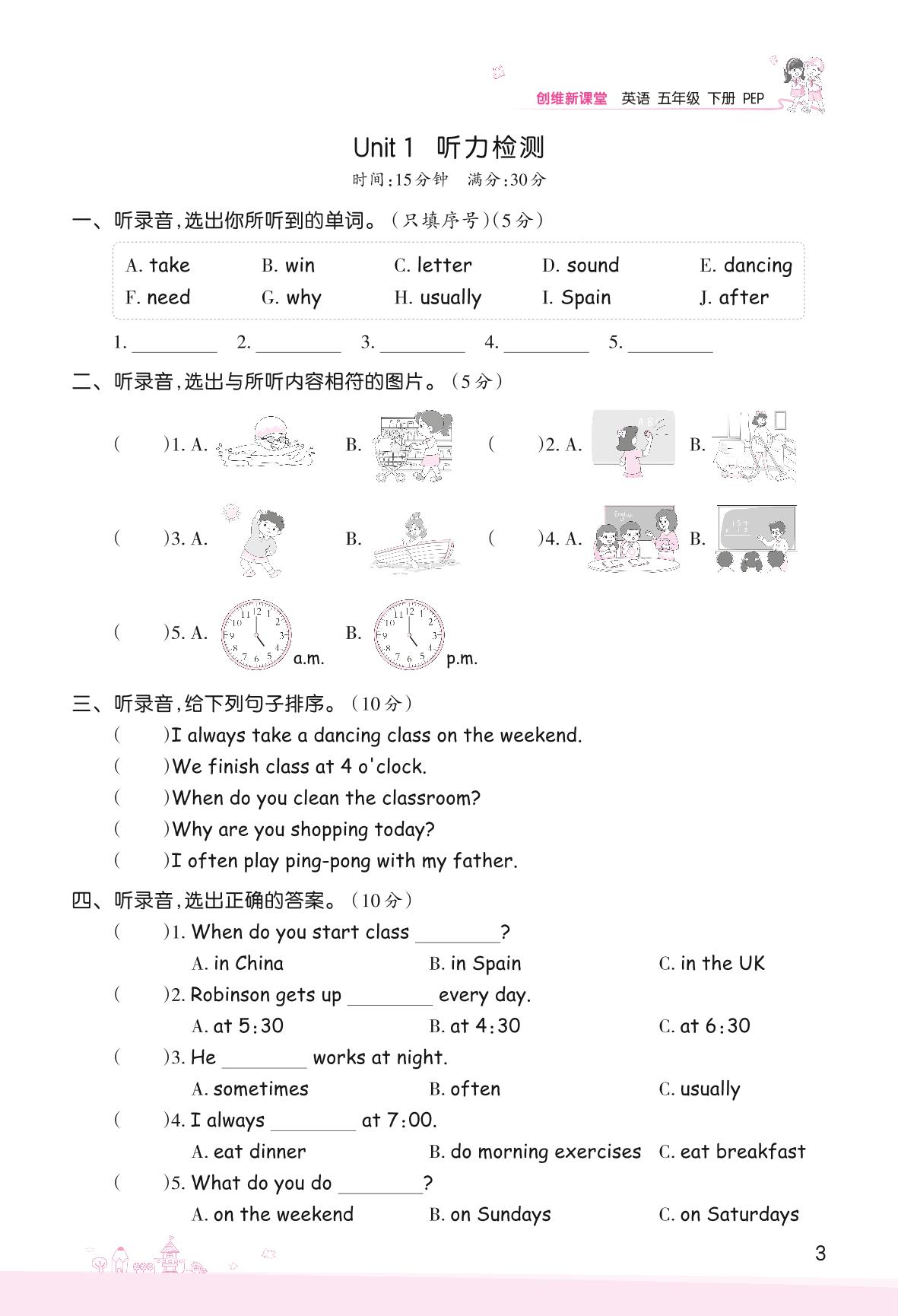2022下册五年级英语人教PEP版 Unit 1 My day—听力检测