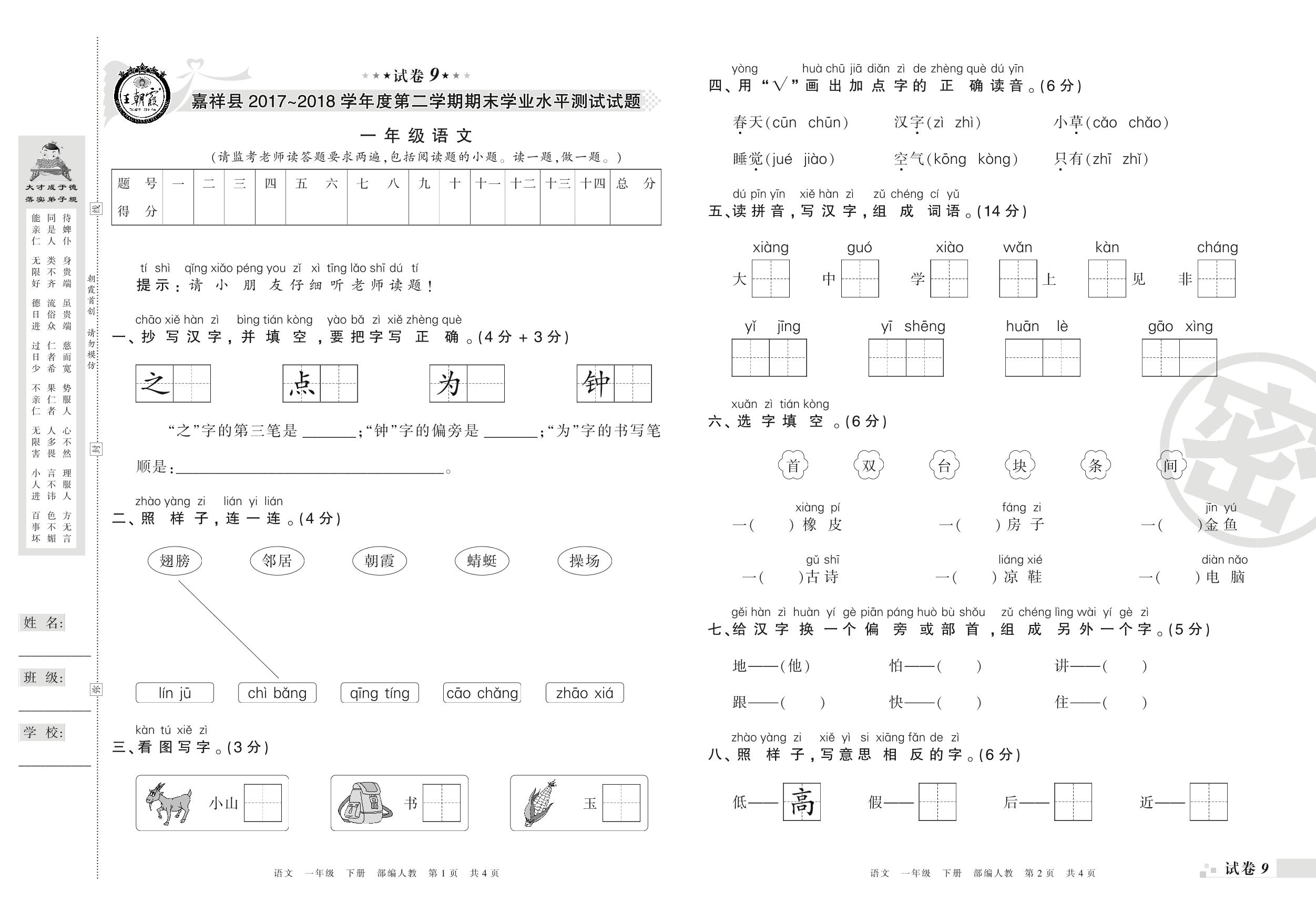 2017-2018学年第二学期济宁市嘉祥县一年级语文试卷(人教版)【9】