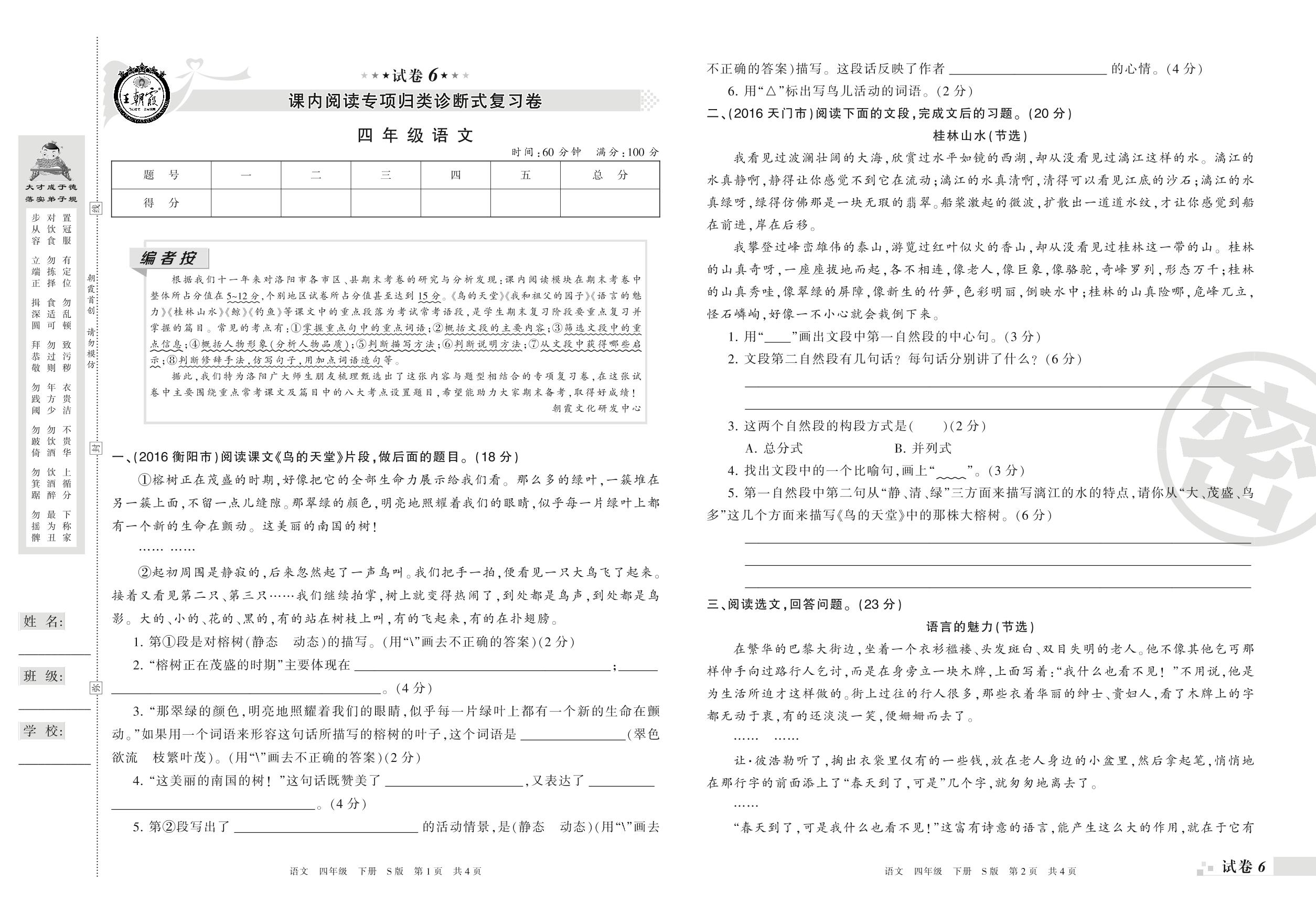 王朝霞期末专项卷——课内阅读专项归类诊断式复习卷四年级下册语文(S版)_R210801231943【6】