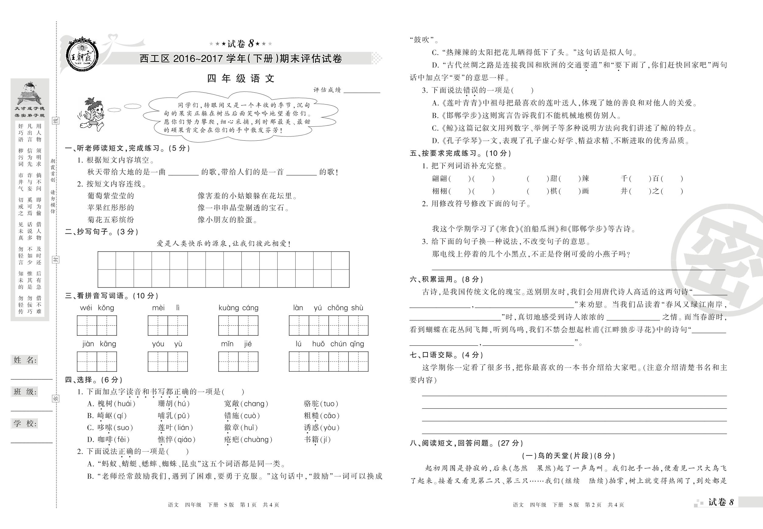 2016-2017学年第二学期洛阳市西工区四年级语文试卷(S版)【8】