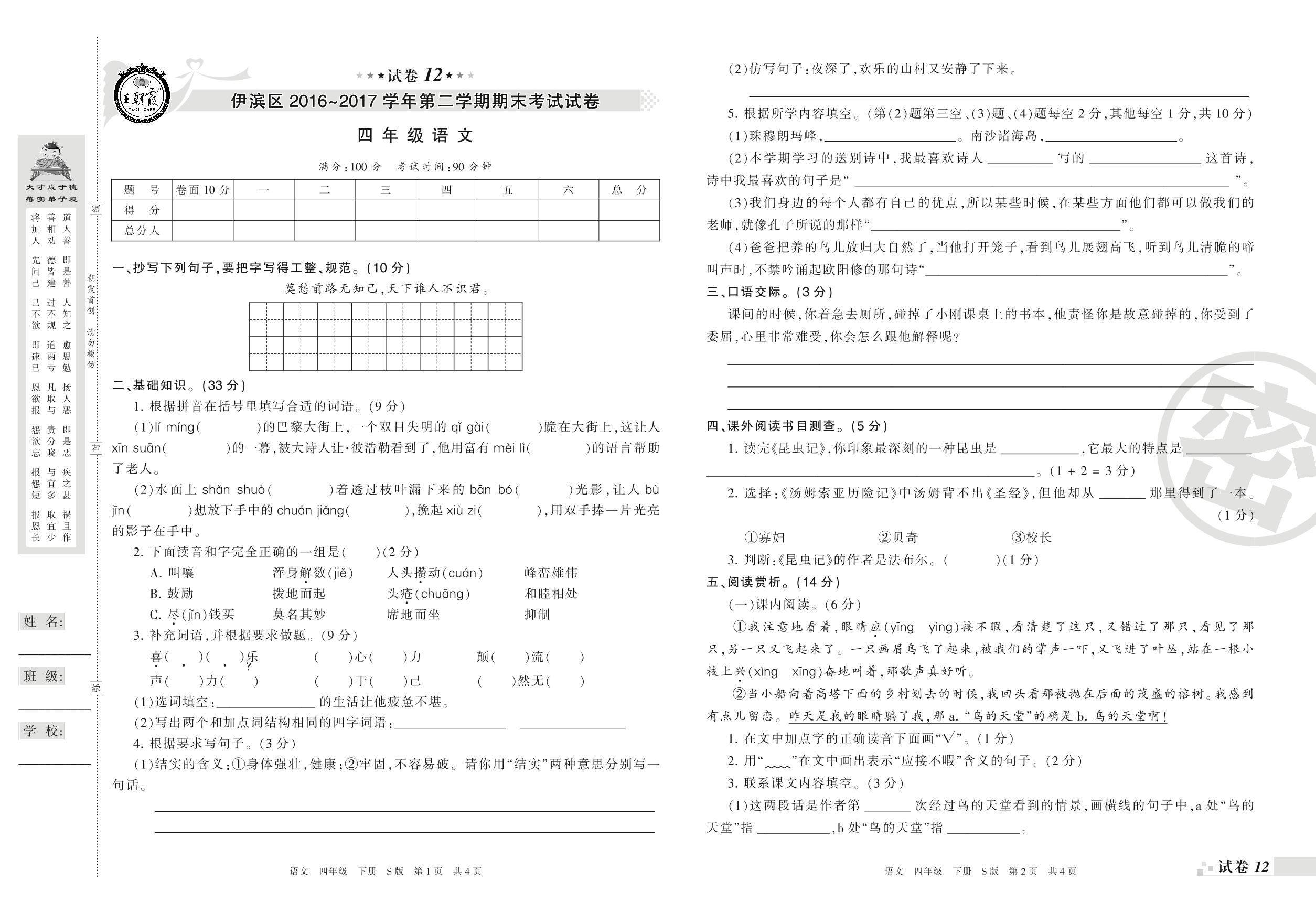 2016-2017学年第二学期洛阳市伊滨区四年级语文试卷(S版)【12】