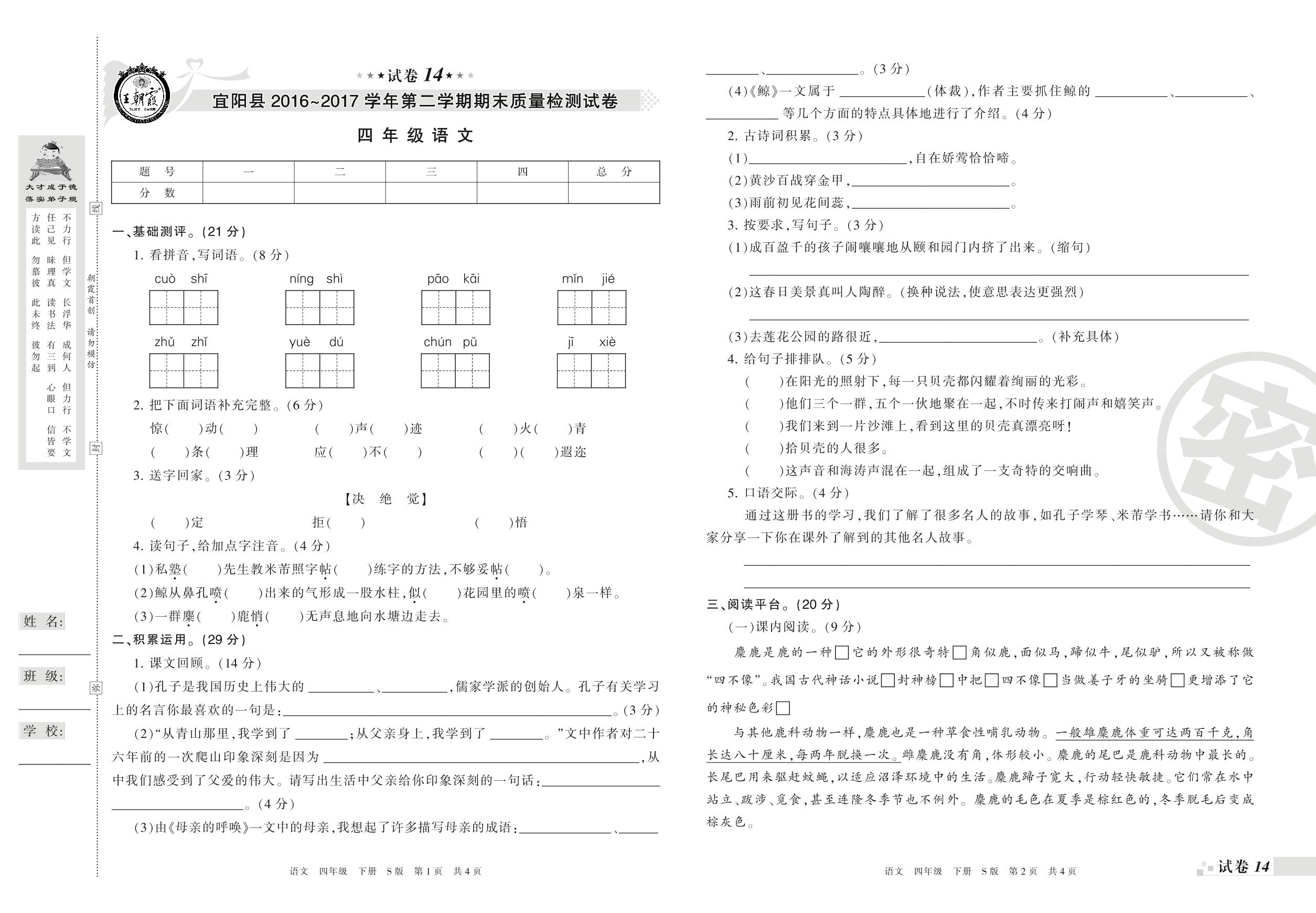 2016-2017学年第二学期洛阳市宜阳县四年级语文试卷(S版)【14】