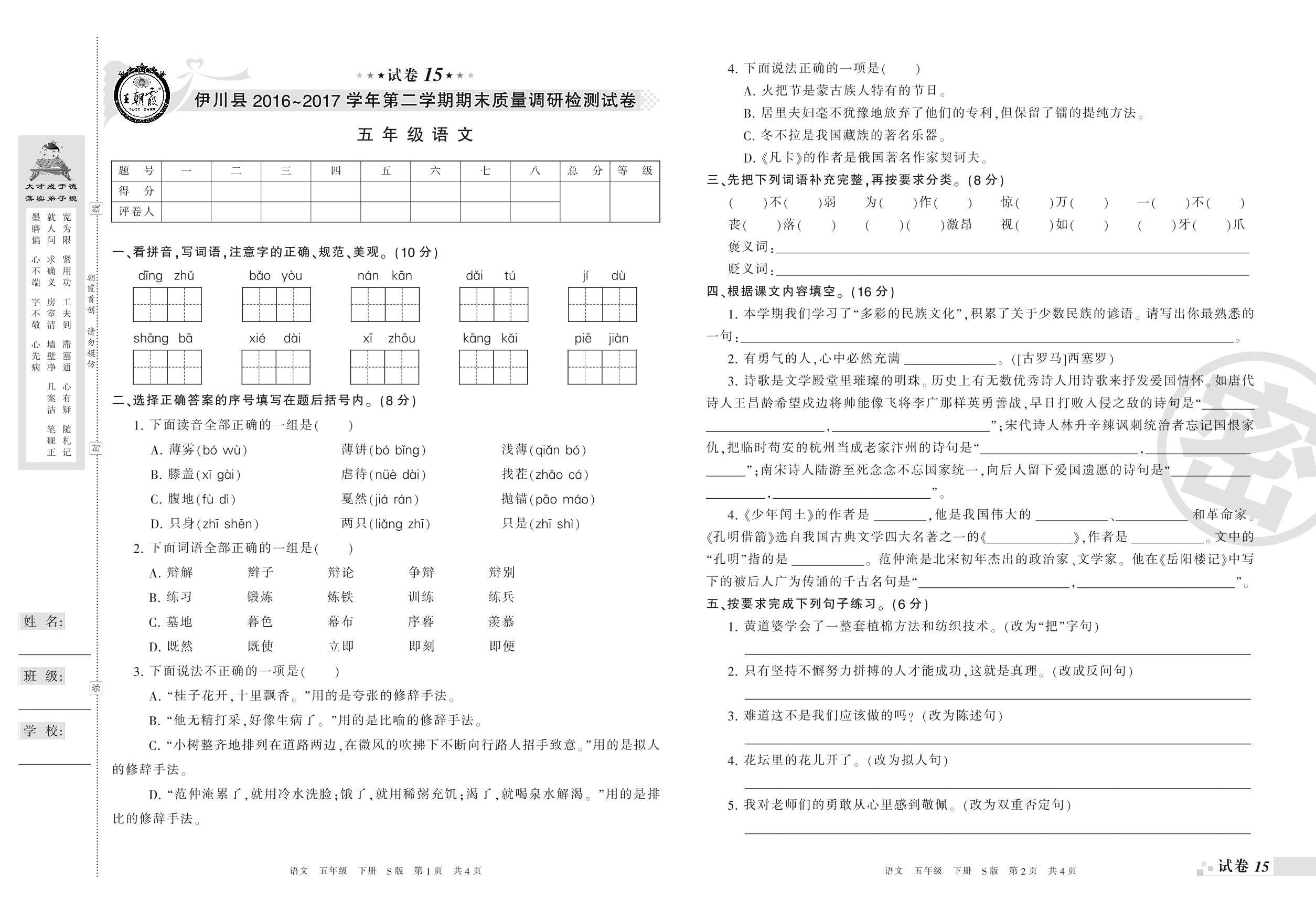 2016-2017学年第二学期洛阳市伊川县五年级语文试卷(S版)【15】
