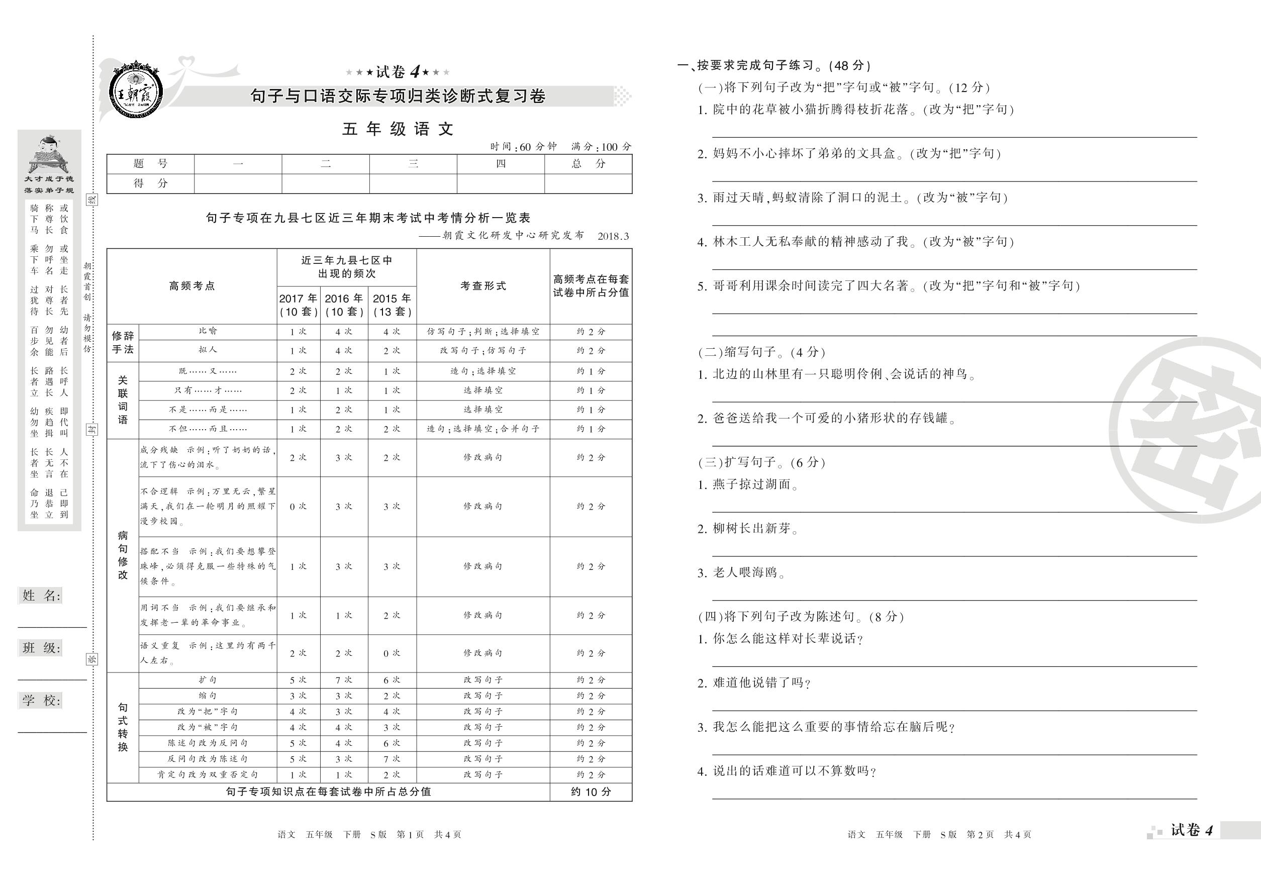 王朝霞期末专项卷——句子与口语交际专项归类诊断式复习卷五年级下册语文(S版)_R210801232026【4】