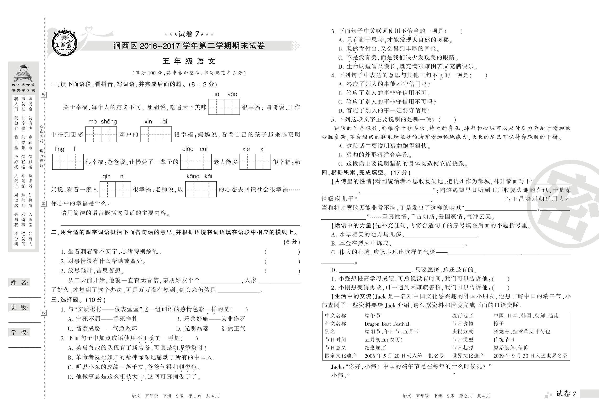 2016-2017学年第二学期洛阳市涧西区五年级语文试卷(S版)【7】