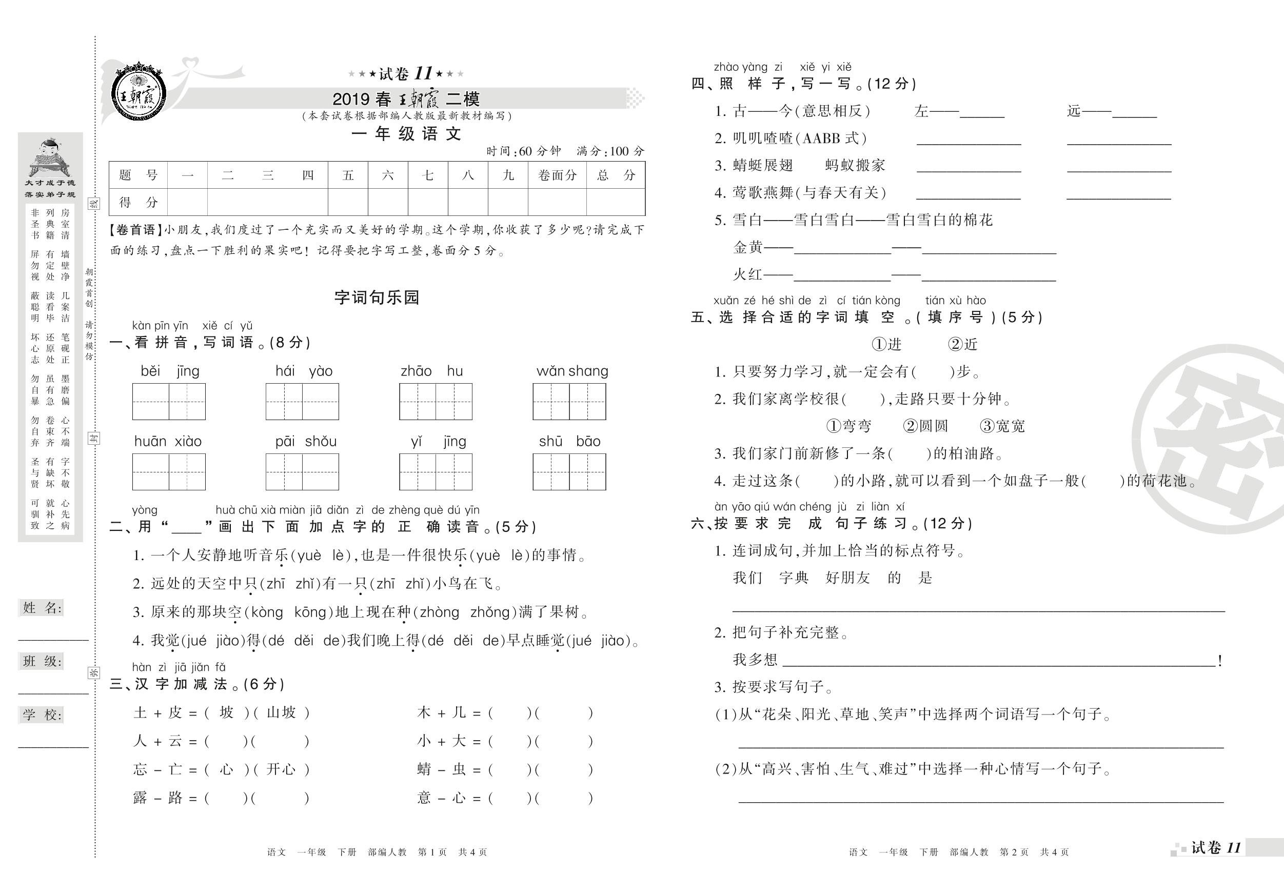 王朝霞期末模拟卷一年级下册语文(人教版)_R210731182806【11】