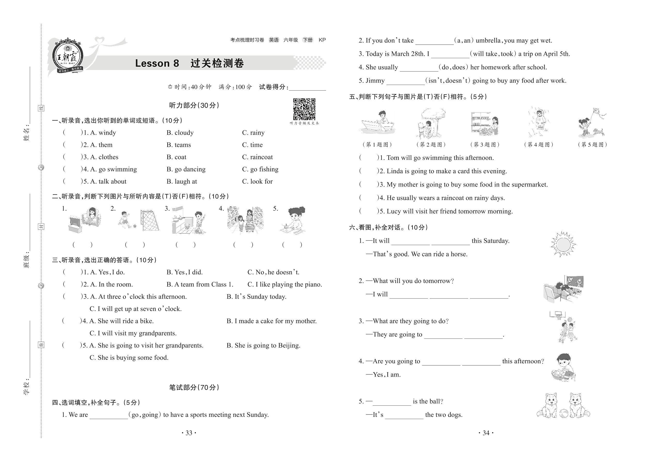 2022下册六年级英语科普版 Lesson 8 过关检测卷