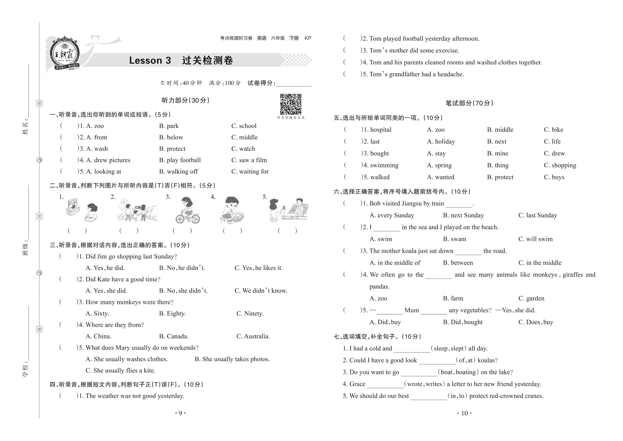 2022下册六年级英语科普版 Lesson 3 过关检测卷
