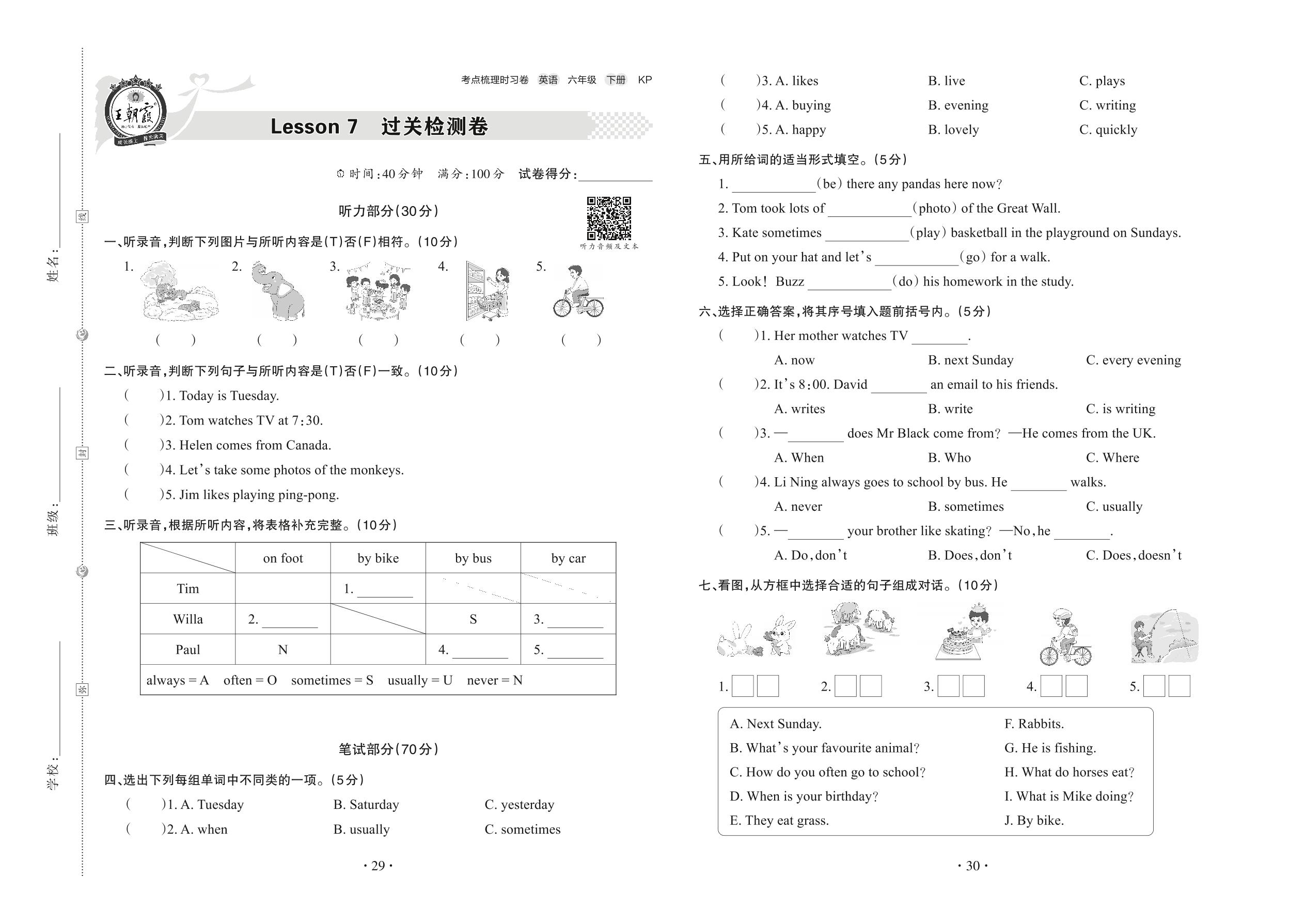 2022下册六年级英语科普版 Lesson 7 过关检测卷