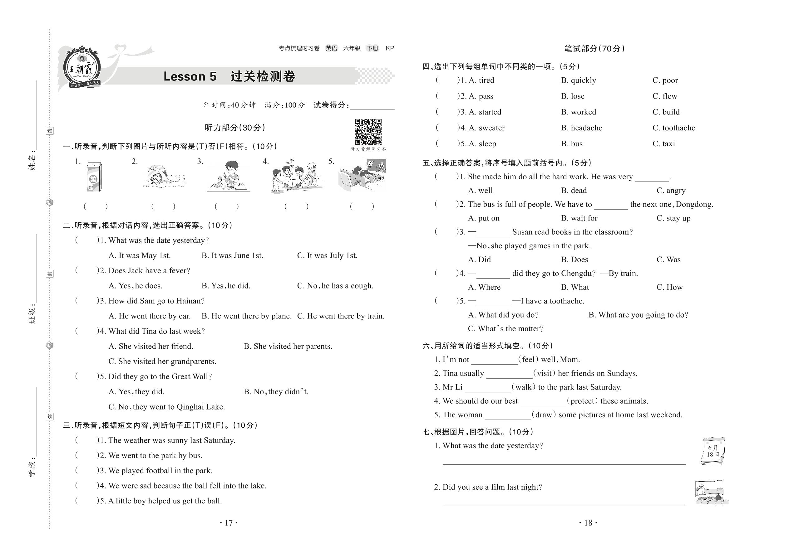 2022下册六年级英语科普版 Lesson 5 过关检测卷