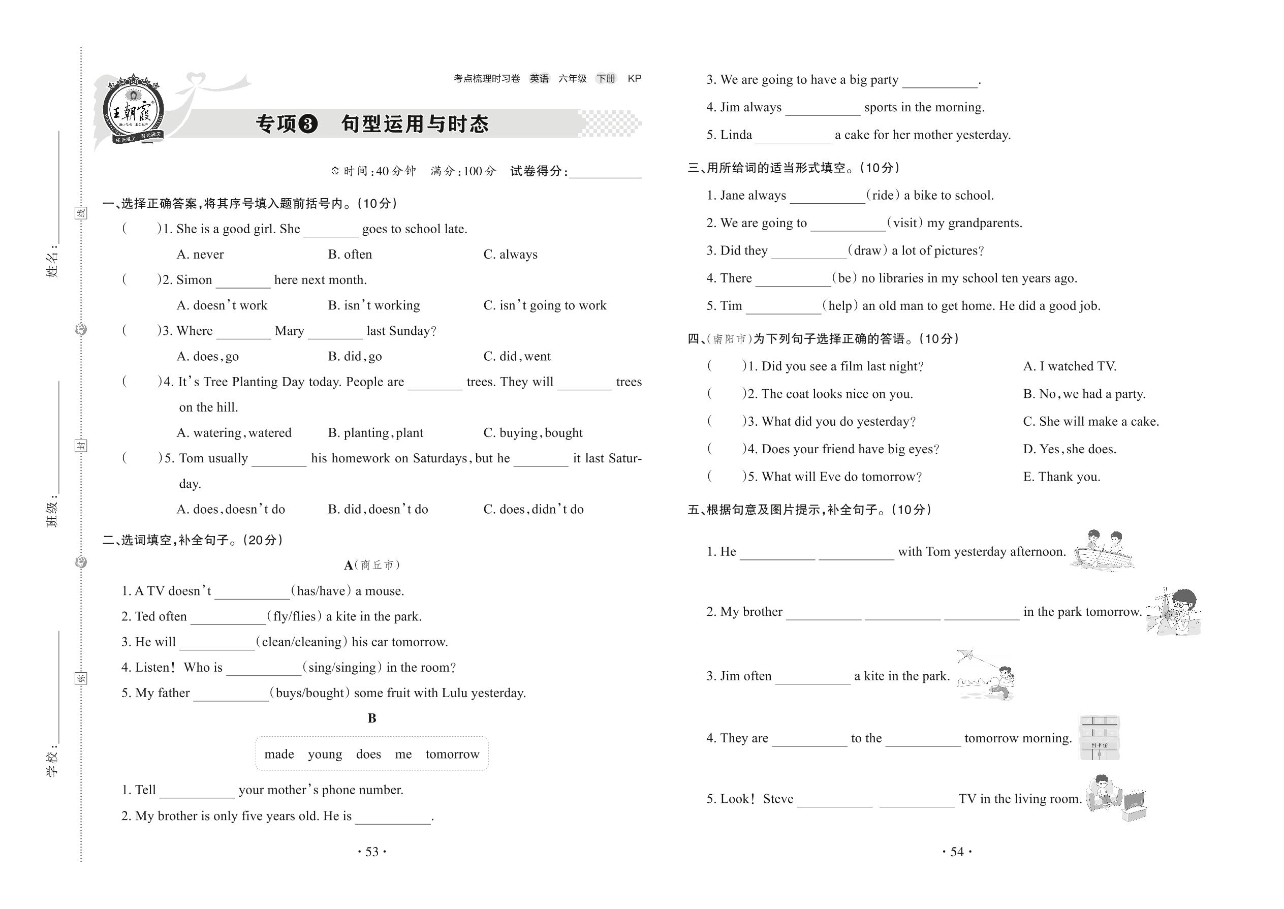 2022下册六年级英语科普版 专项3 句型运用与时态