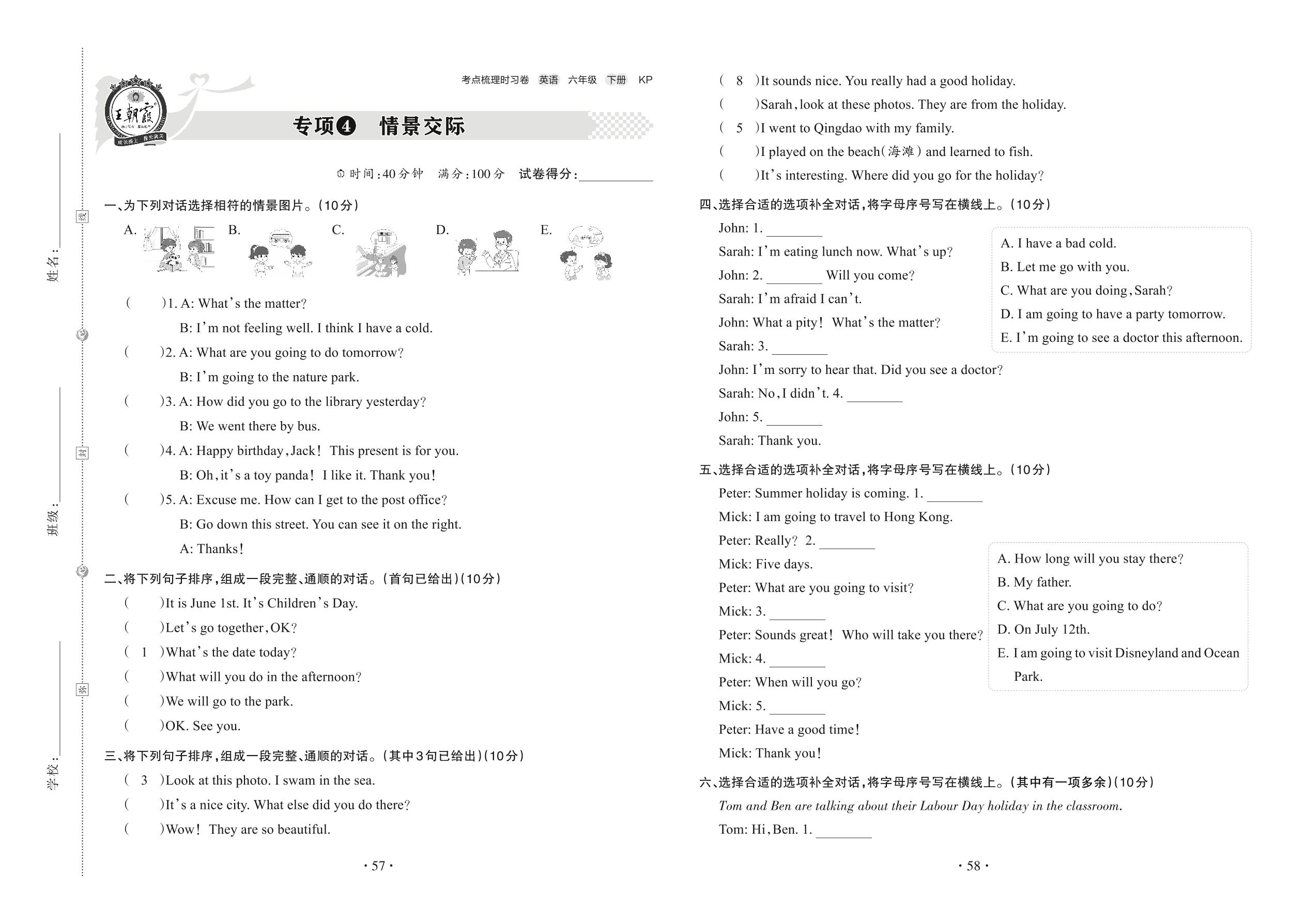 2022下册六年级英语科普版 专项4 情景交际