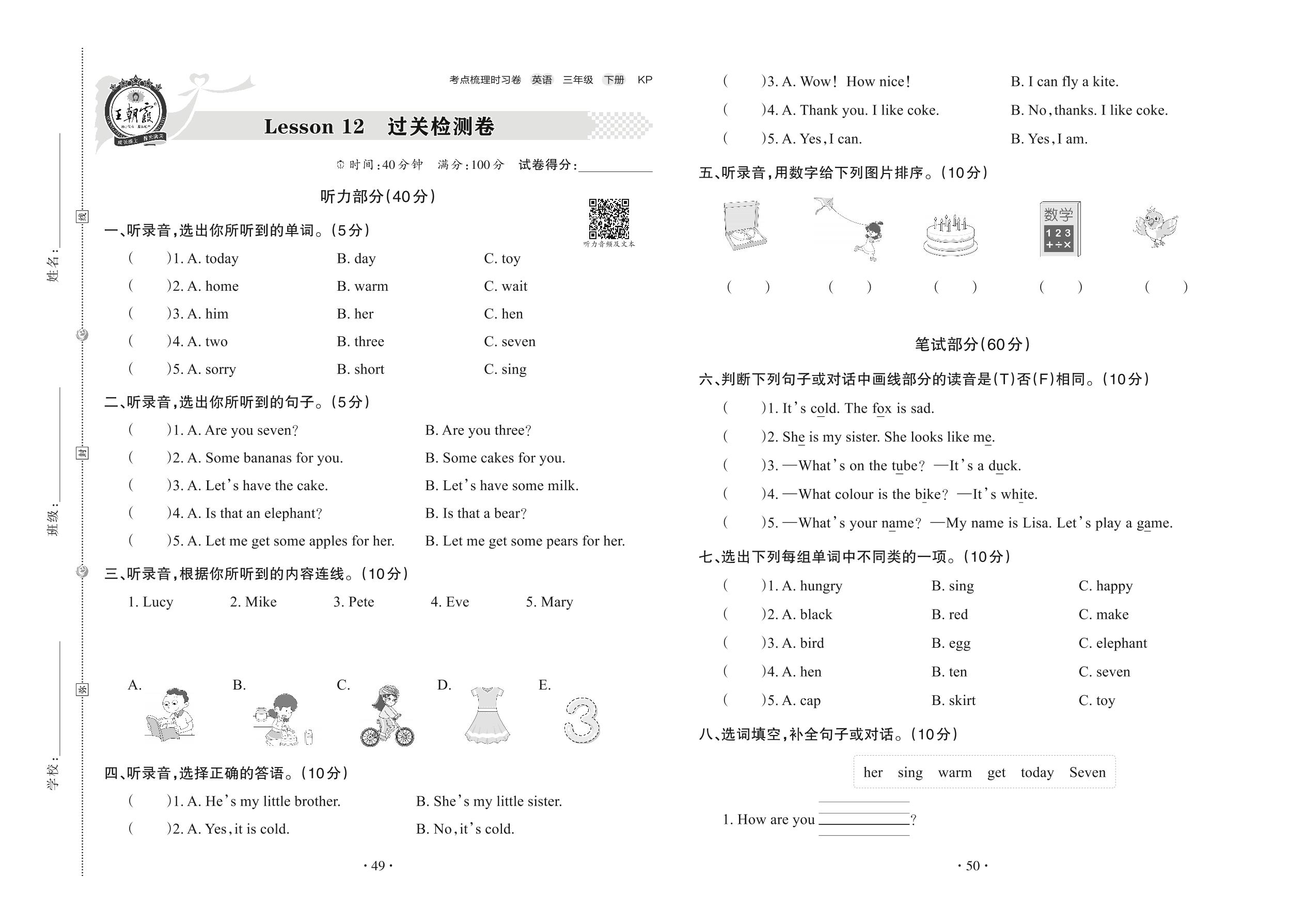 2022下册三年级英语科普版 Lesson 12 过关检测卷