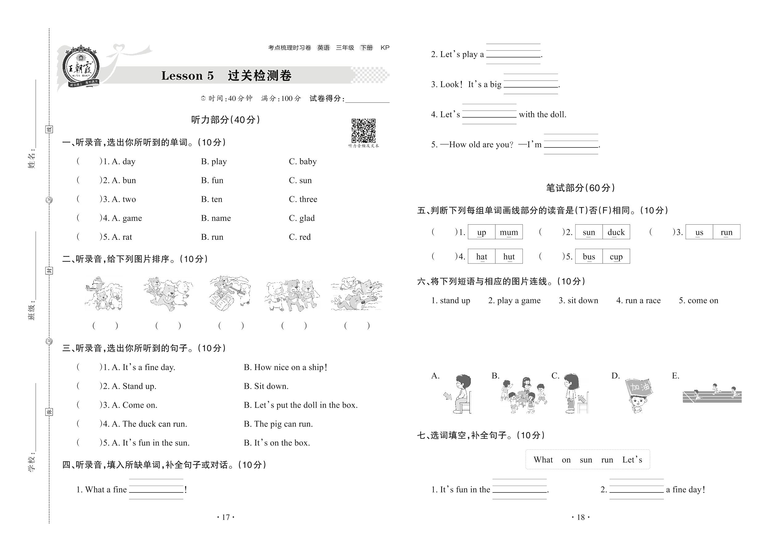 2022下册三年级英语科普版 Lesson 5 过关检测卷