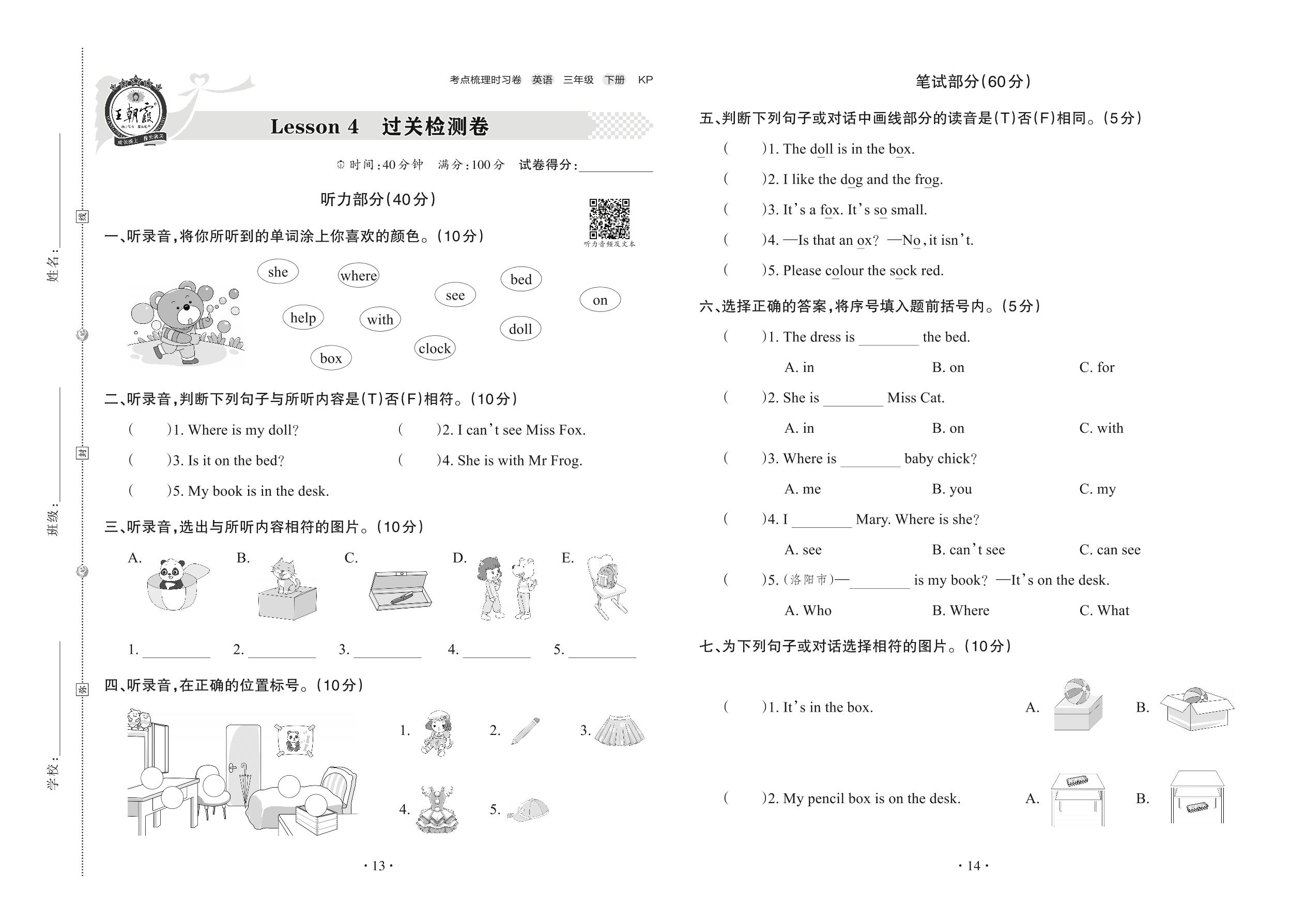 2022下册三年级英语科普版 Lesson 4 过关检测卷