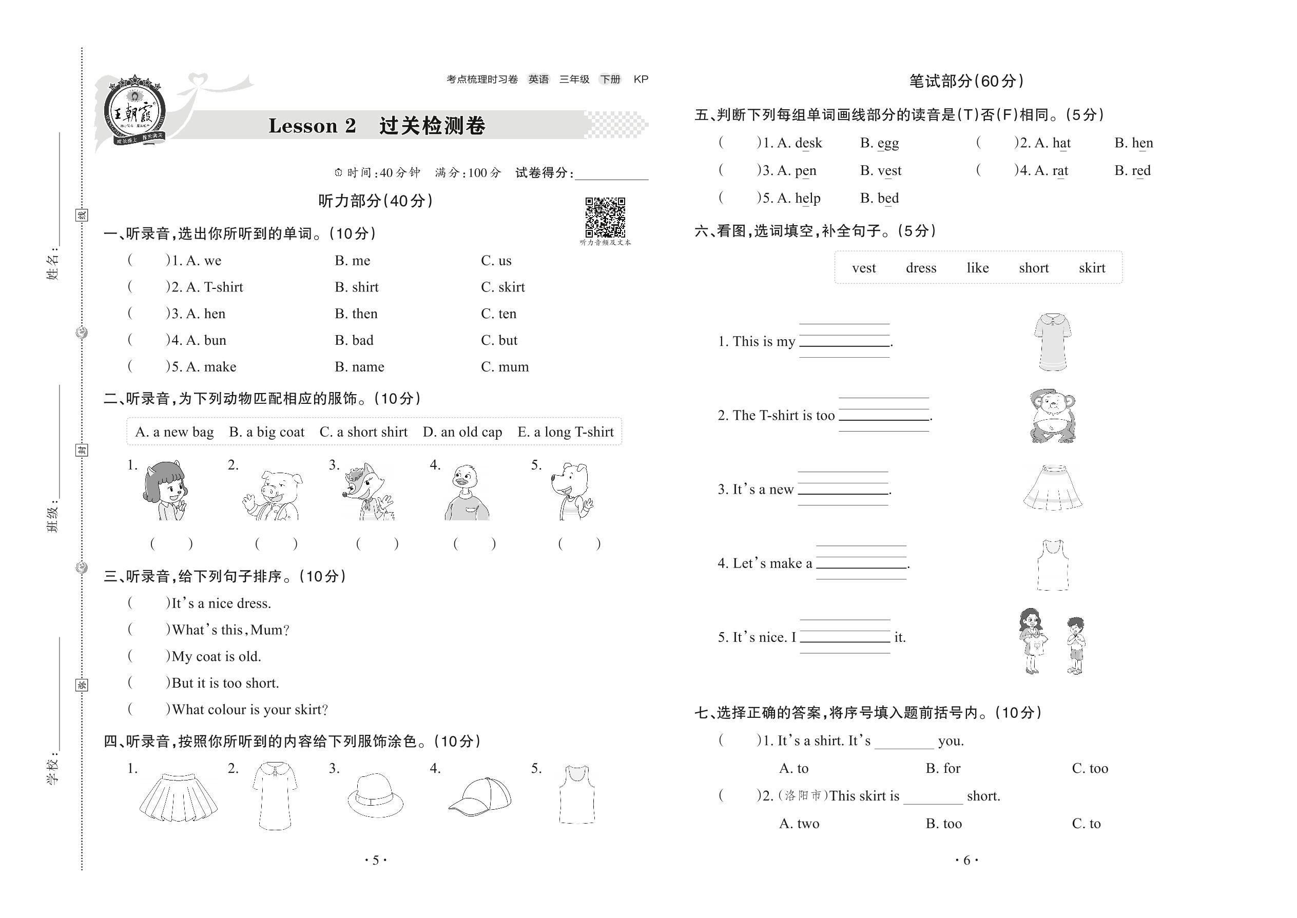 2022下册三年级英语科普版 Lesson 2 过关检测卷