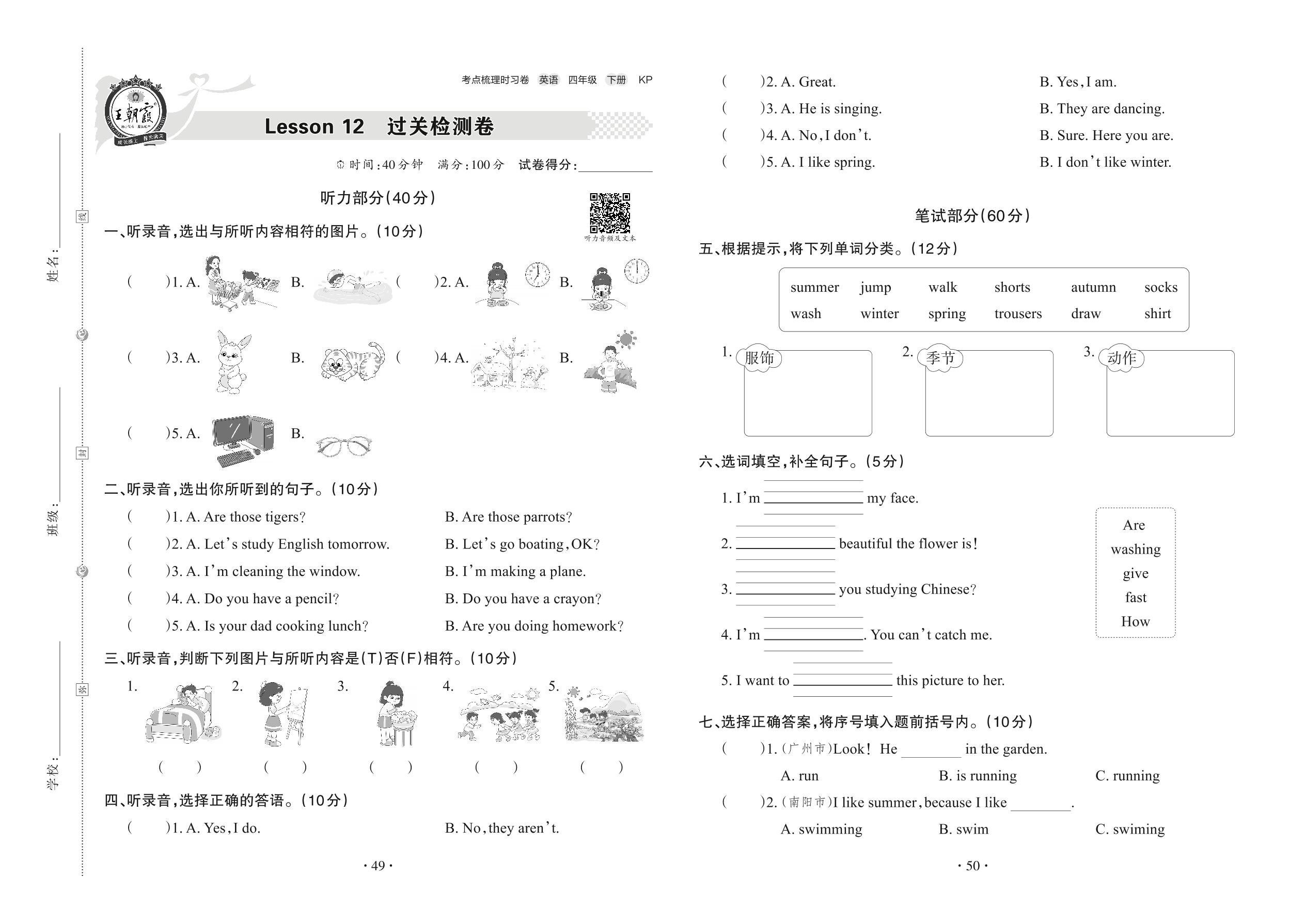 2022下册四年级英语科普版 Lesson 12 过关检测卷