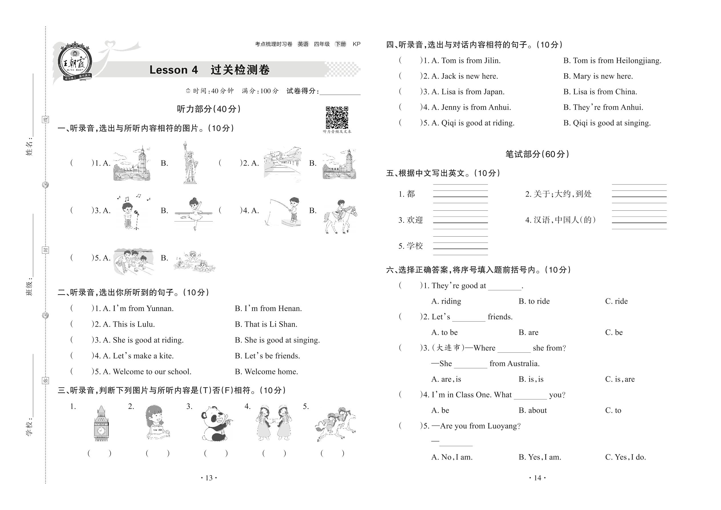 2022下册四年级英语科普版 Lesson 4 过关检测卷