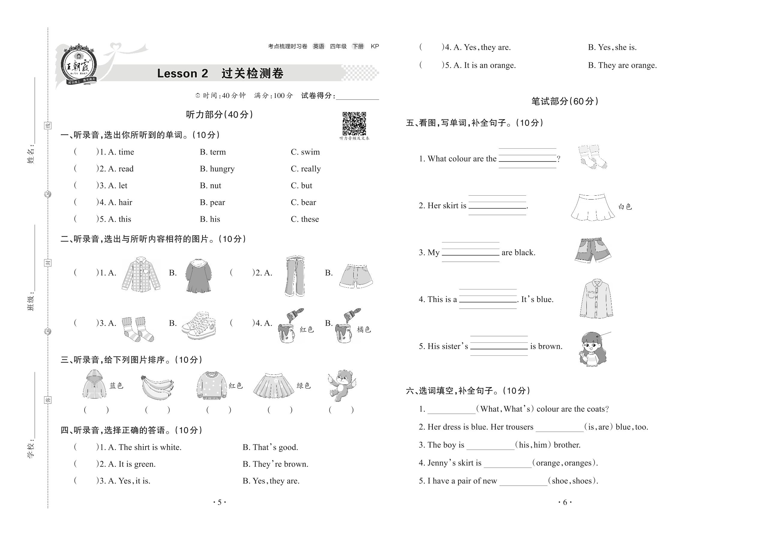 2022下册四年级英语科普版 Lesson 2 过关检测卷