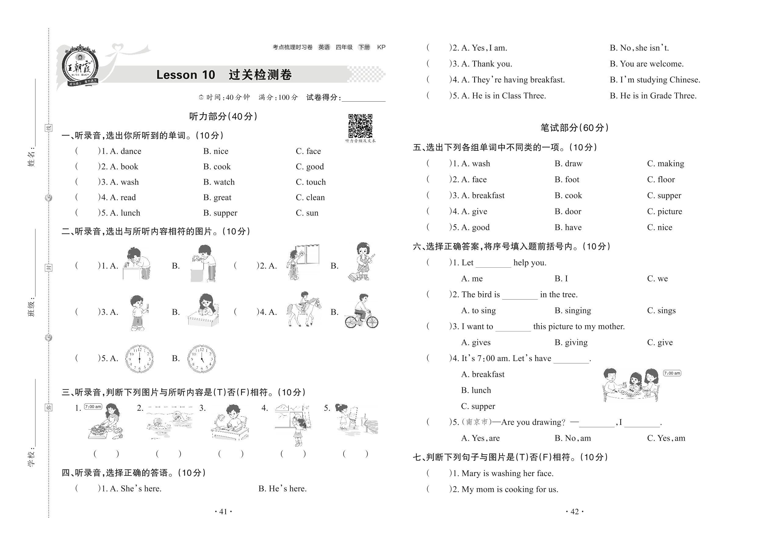 2022下册四年级英语科普版 Lesson 10 过关检测卷