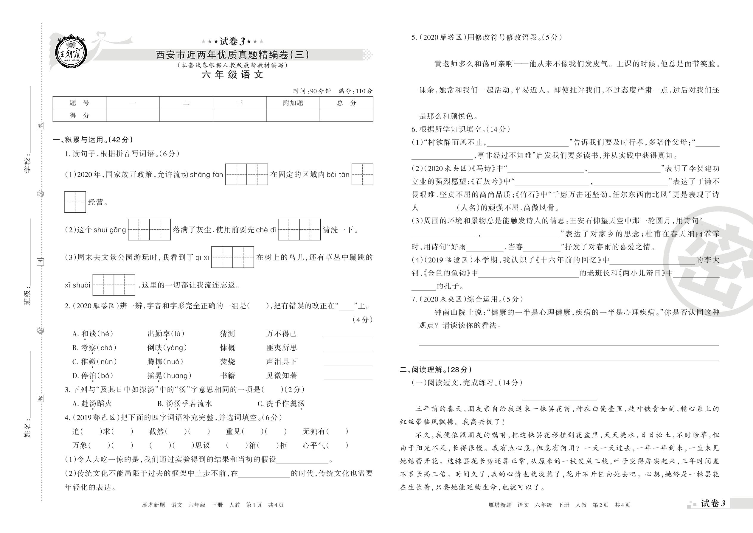 优质试题精编卷(三)六年级下册语文(人教版)【3】