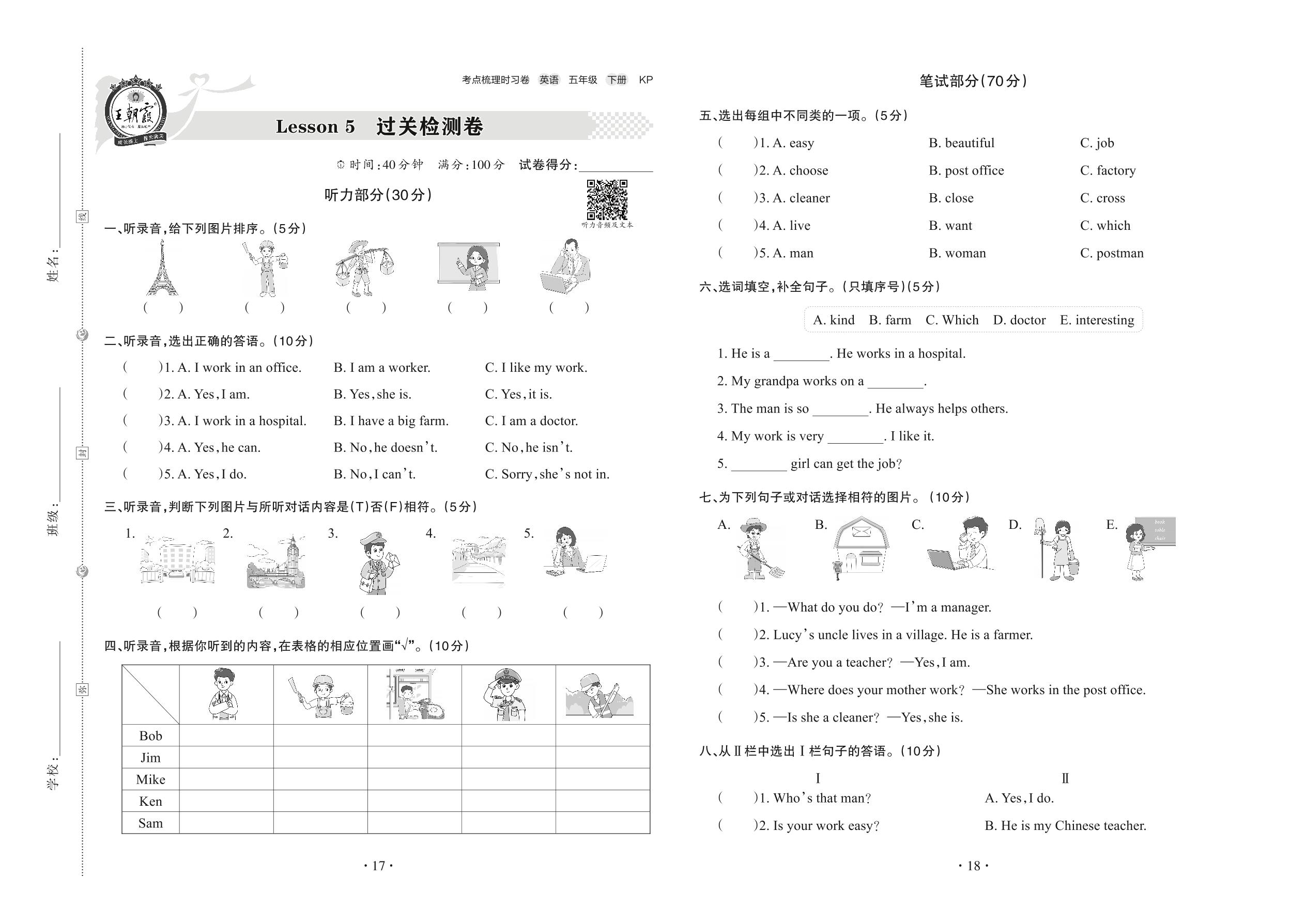2022下册五年级英语科普版 Lesson 5 过关检测卷