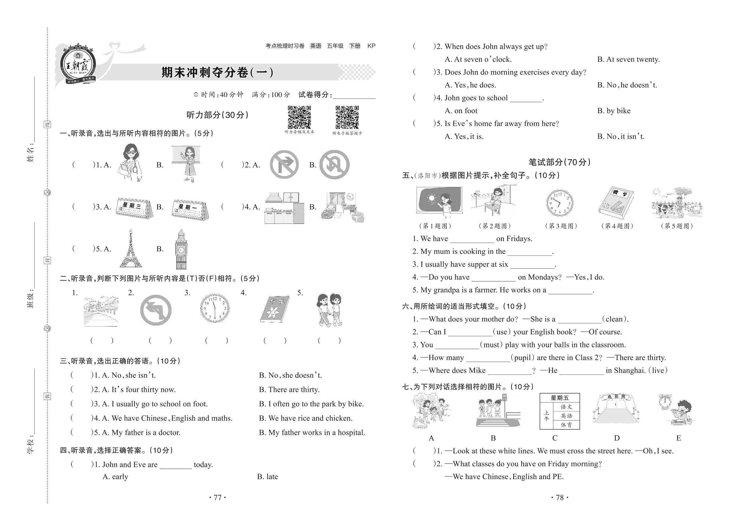 2022下册五年级英语科普版 期末冲刺夺分卷(一)