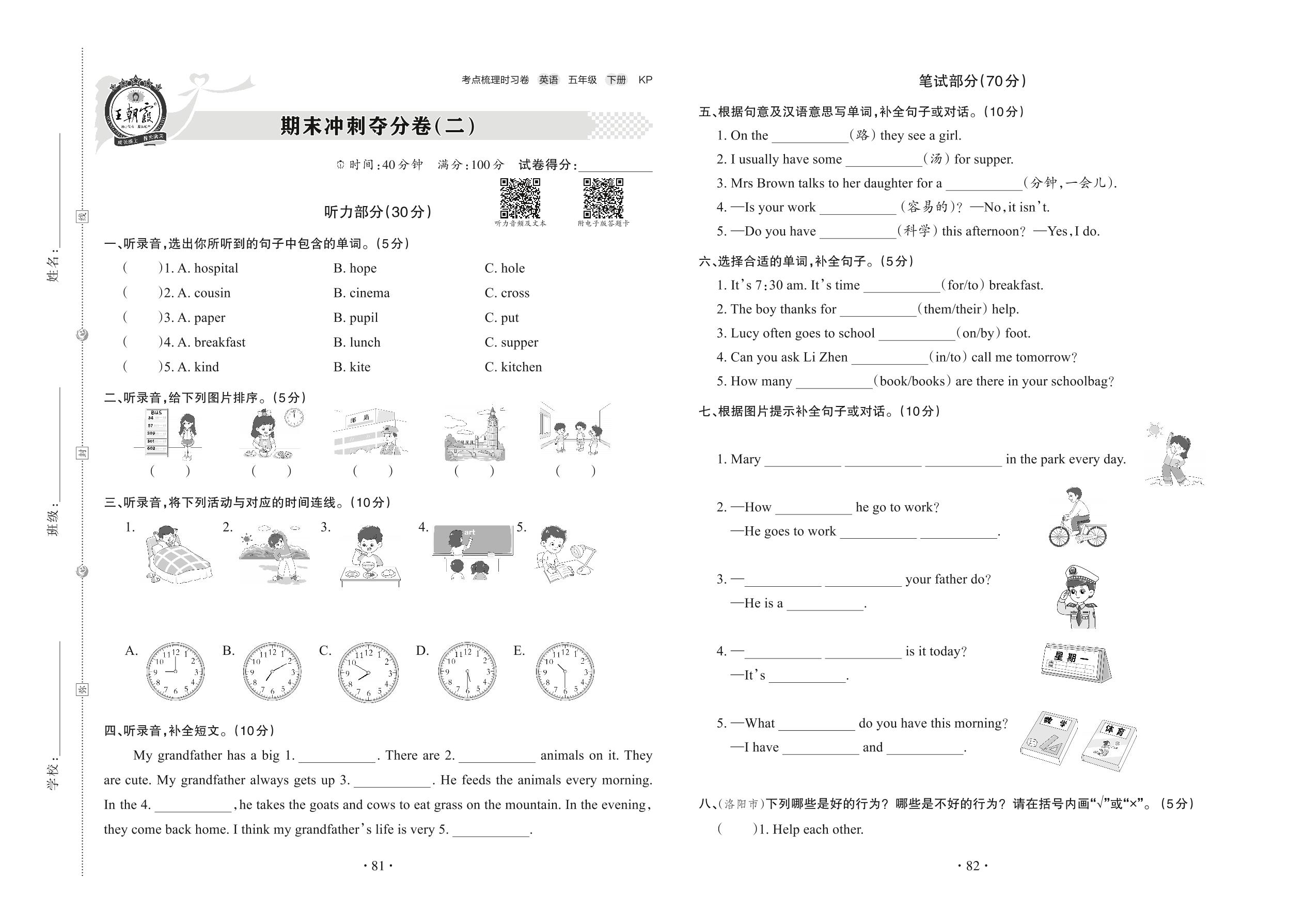 2022下册五年级英语科普版 期末冲刺夺分卷(二)